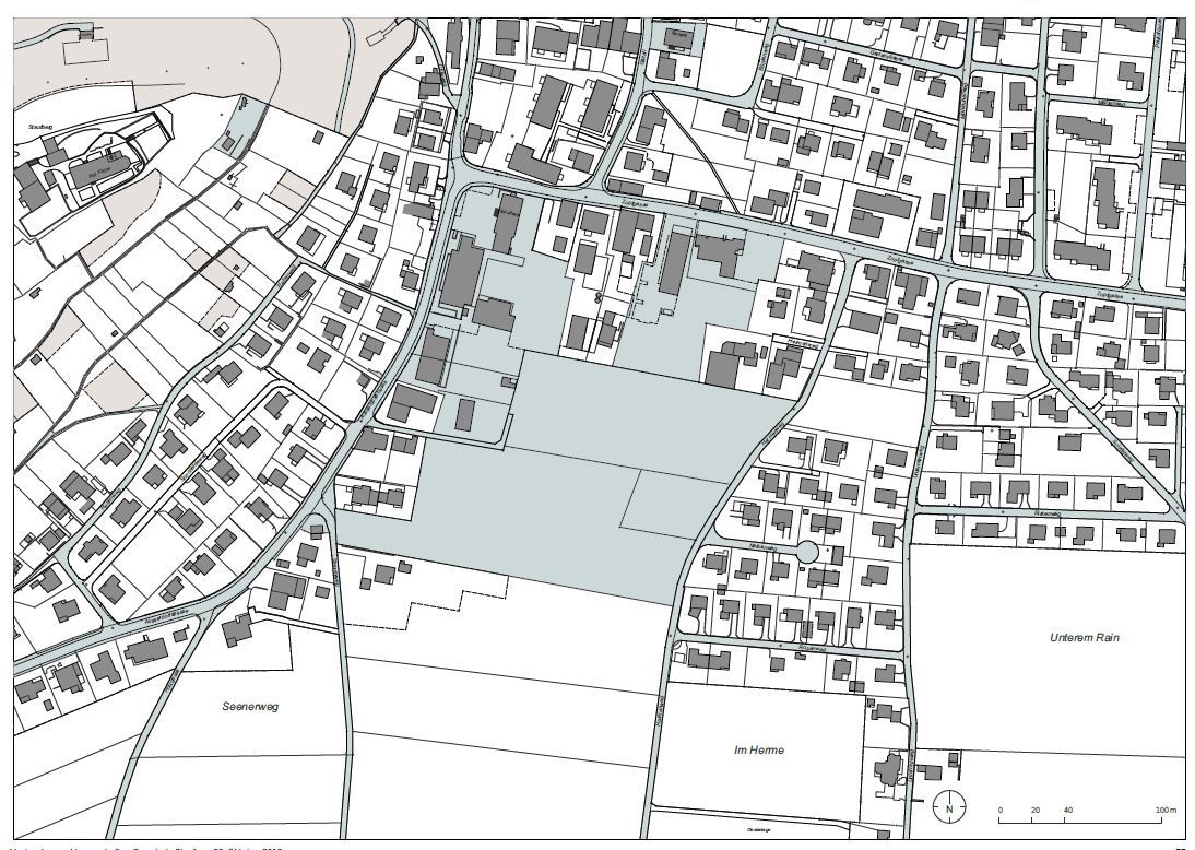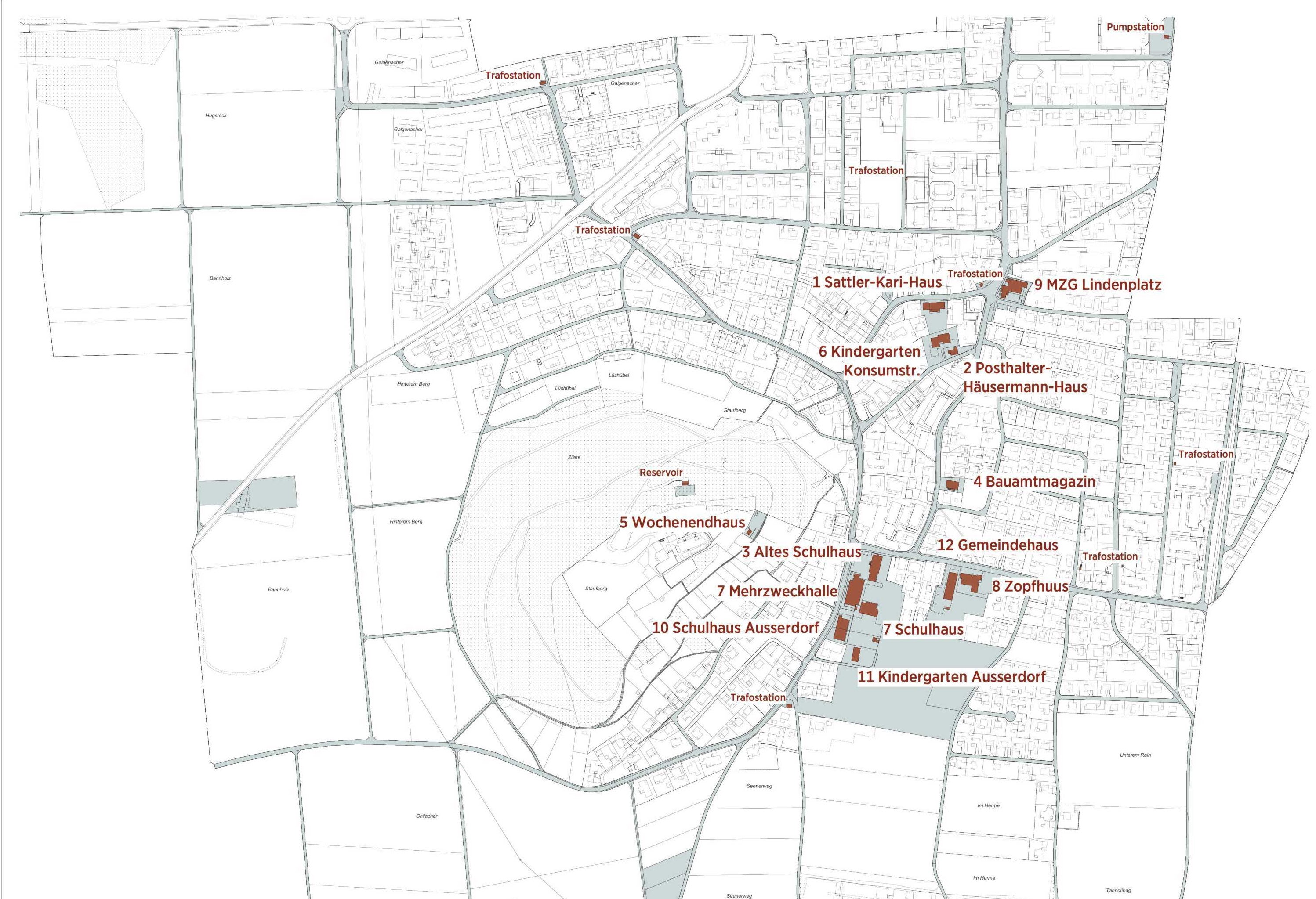 Die Pläne unten zeigen die Liegenschaften im Gemeindeeigentum sowie das Areal rund um die Schule.