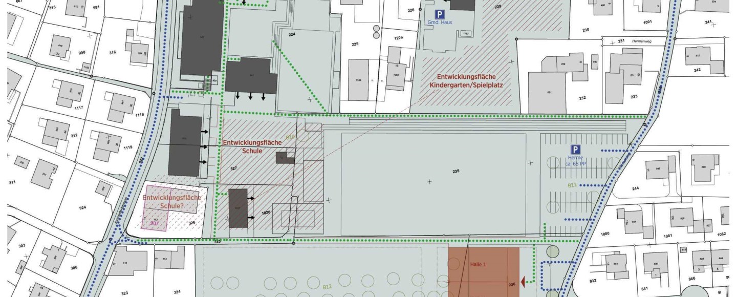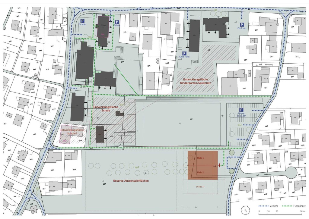 + Raumplanerische Reserveflächen Schulanlage (Erweiterbarkeit)– Erschliessung via Quartierstrasse (Hermenweg)