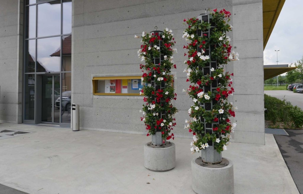 Zwei Blumensäulen werden künftig Besucherinnen und Besucher des Gemeindehaus empfangen.