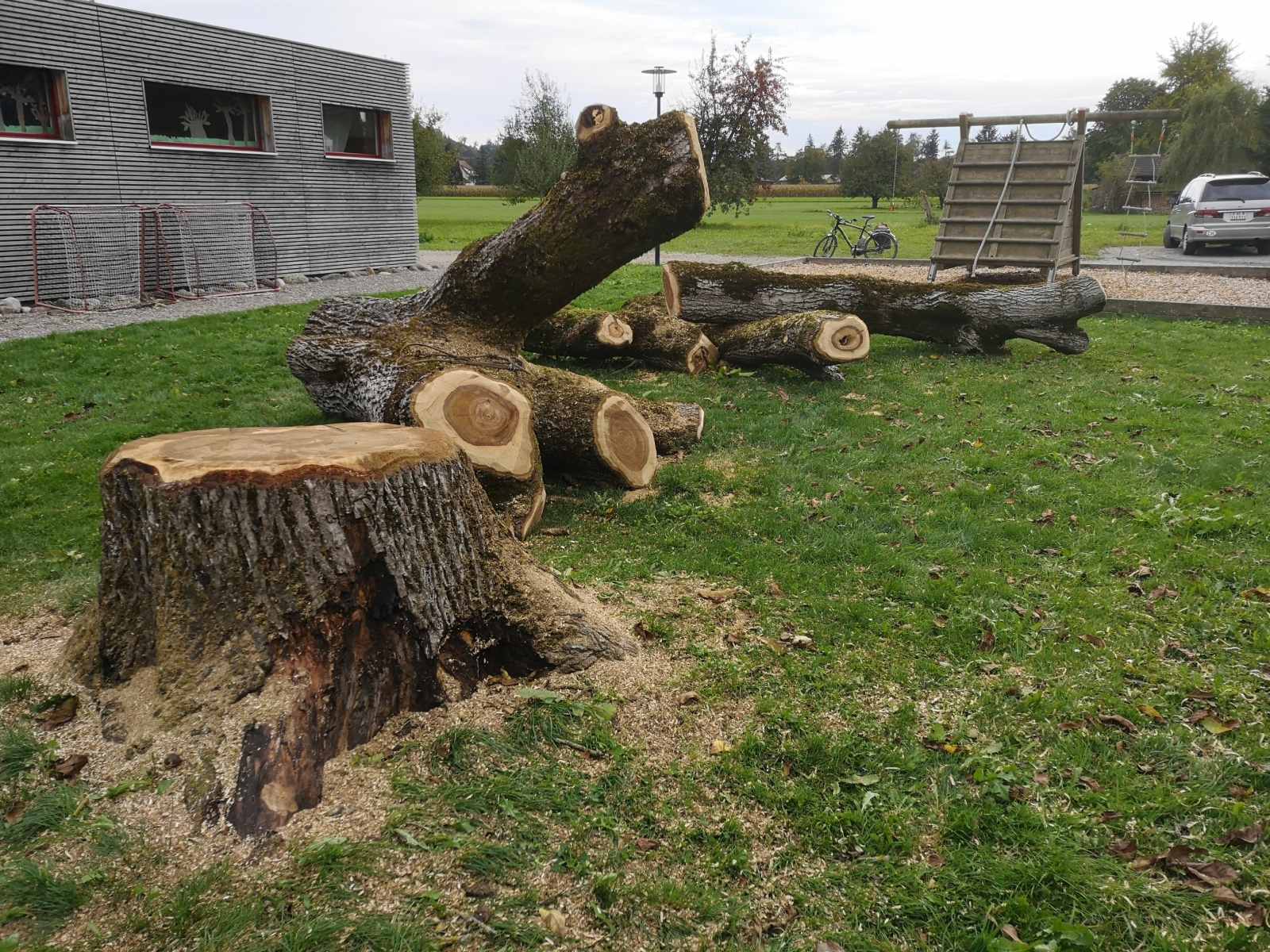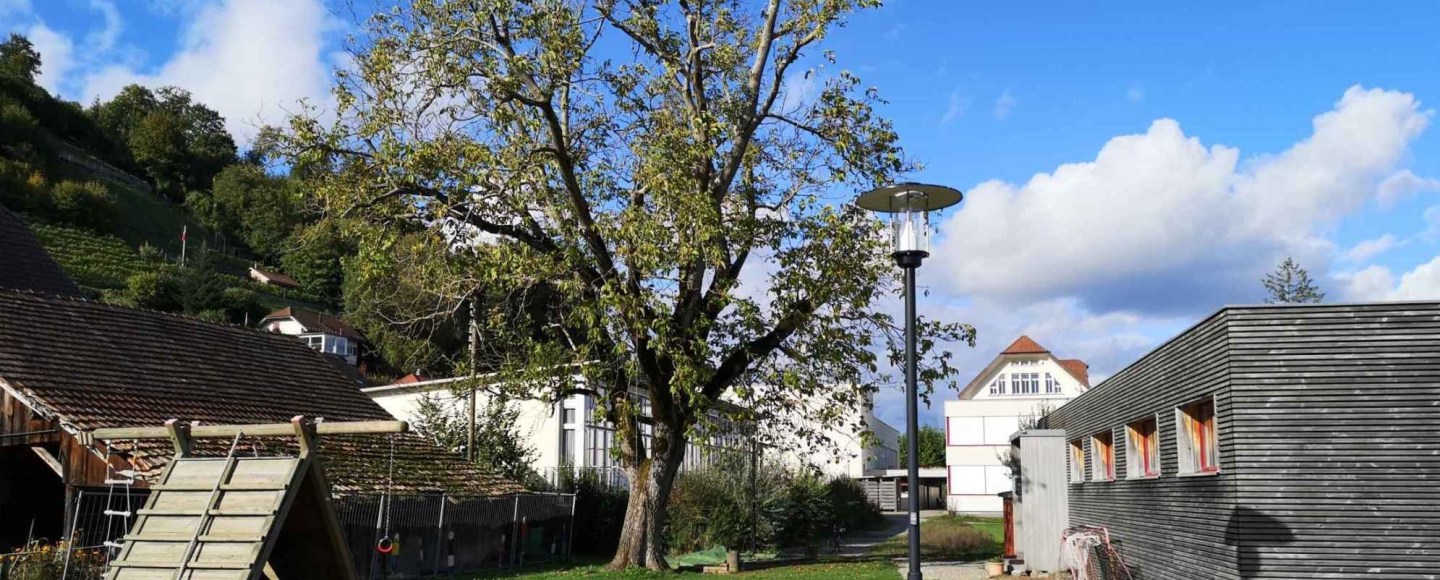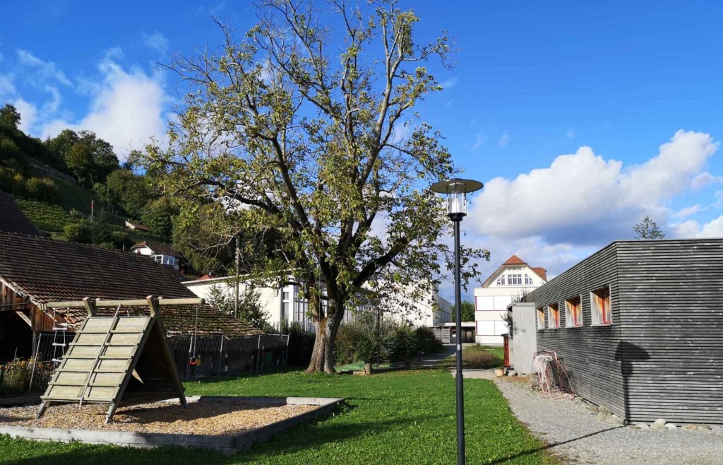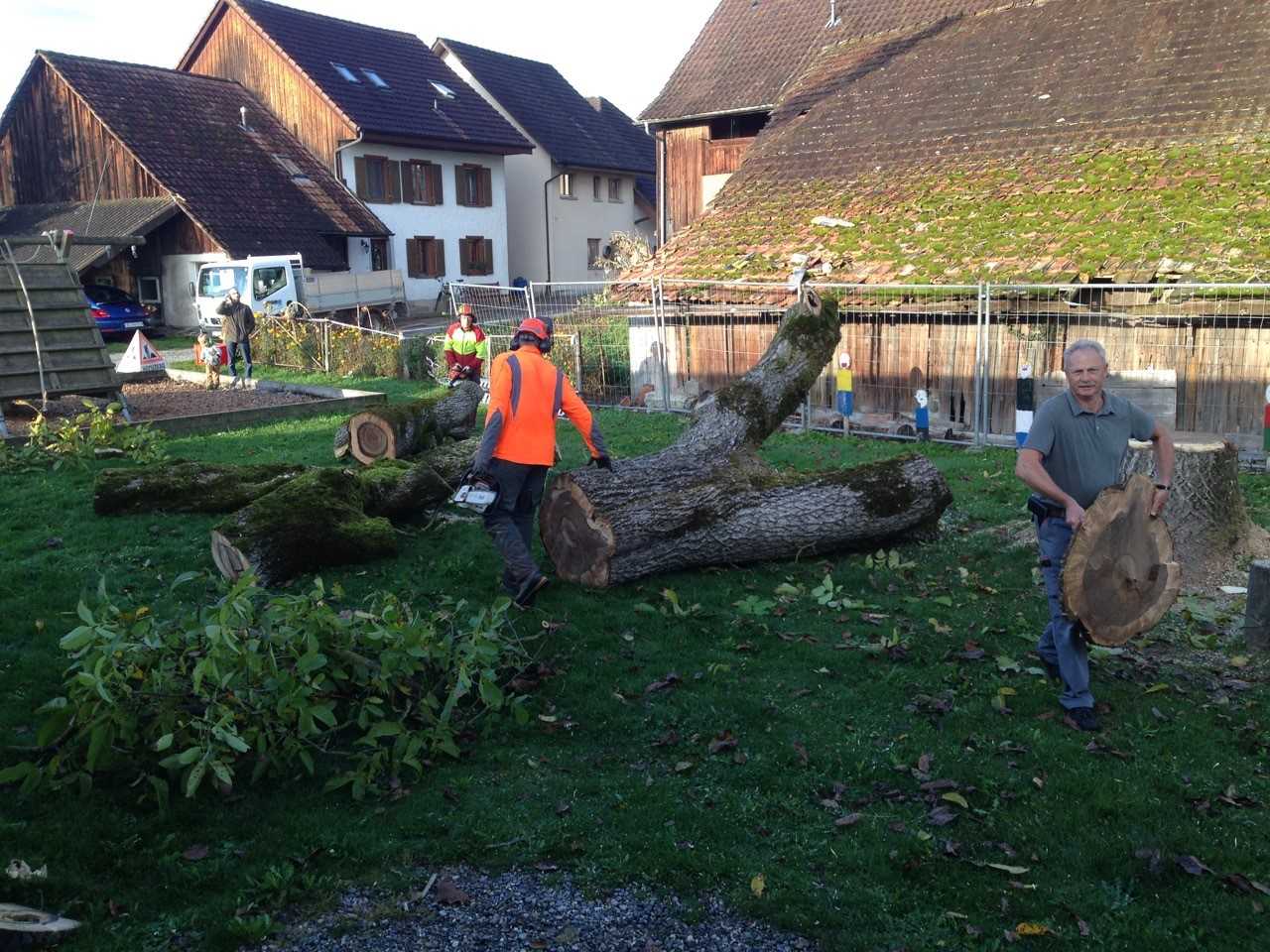 Der legendäre Nussbaum auf dem Schulhausareal, bei dem ganze Schülergenerationen an der herabhängenden Kette und am Pneu Schwing- und Kletterversuche gemacht haben, musste in den Herbstferien aus Sicherheitsgründen gefällt werden. Die ausgelichtete Krone, abgestorbene Seitenäste, ausbleibende Nüsse liessen schon länger ahnen, dass es mit dem Gesundheitszustand des alten Baumes nicht mehr gut steht. Ein Gutachten eines Baumpflegespezialisten brachte nun Klarheit: Der Stamm ist von einem Pilz (Gemeiner Feuerschwamm) befallen, die ganze Baumkrone ist an mehreren Stellen zurücksterbend. Es ist viel Totholz vorhanden. Insgesamt hat es viele grosse Schnitt- und Ausbruchstellen mit ausgedehnter Fäulnis. Mehrere Wurzelanläufe sind ganz oder teilweise abgestorben.
