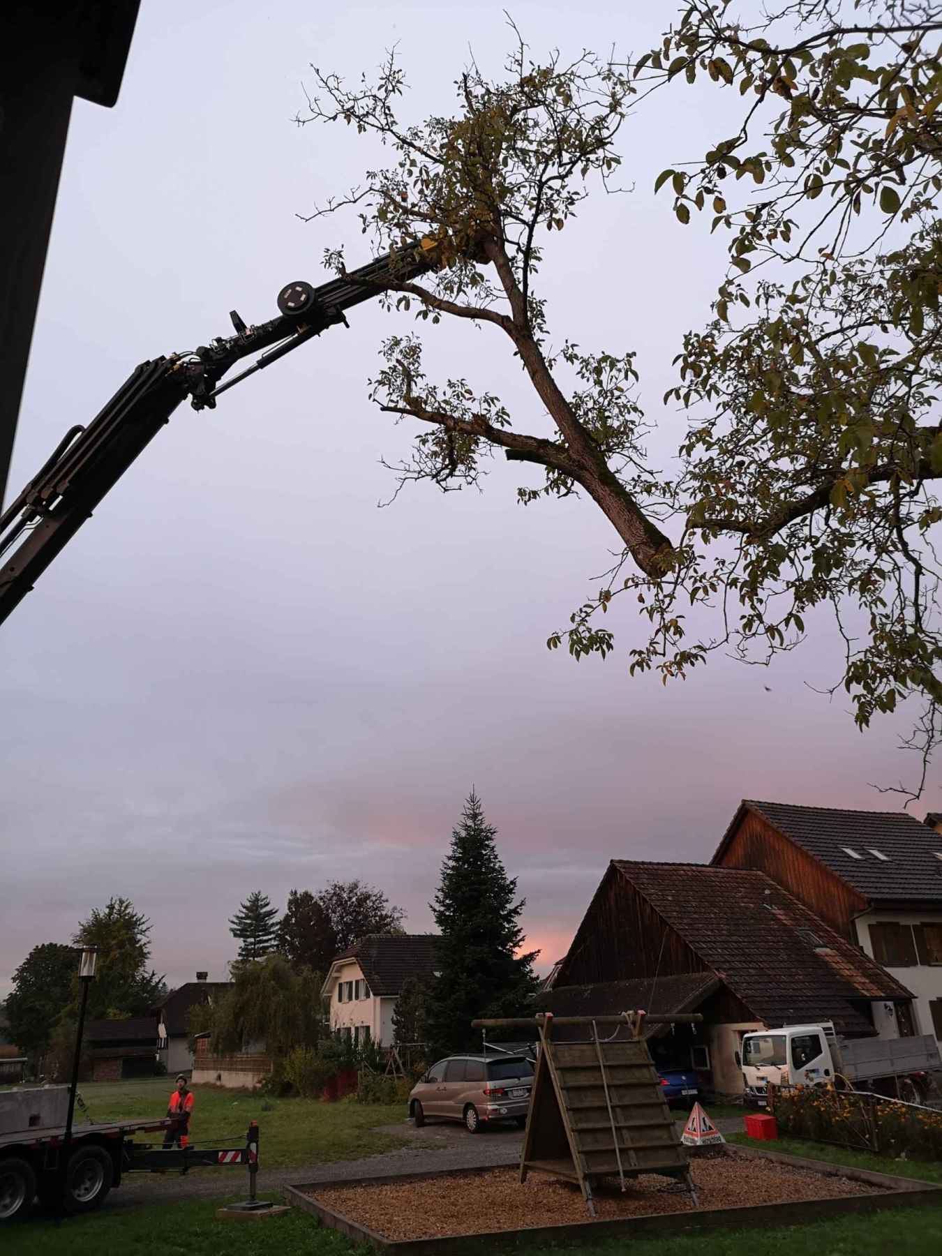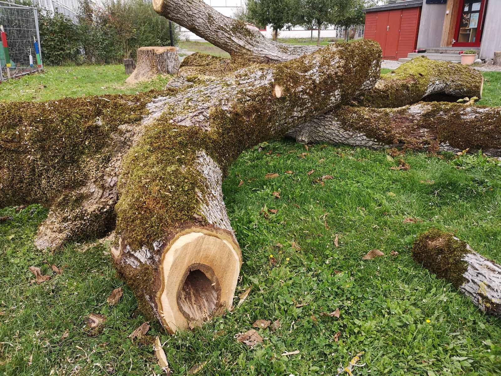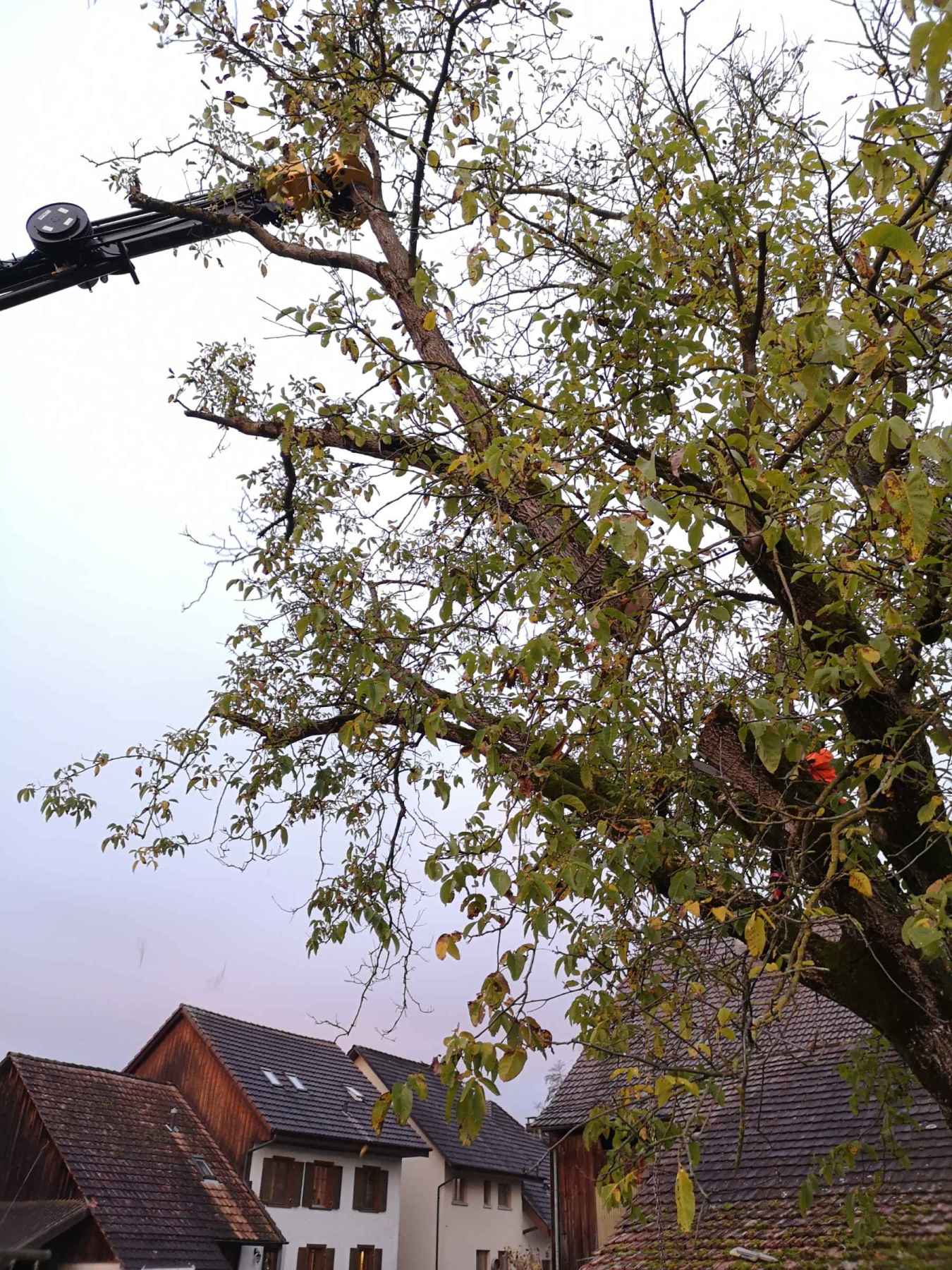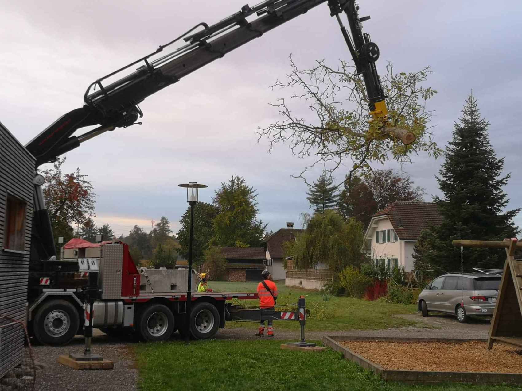 Der legendäre Nussbaum auf dem Schulhausareal, bei dem ganze Schülergenerationen an der herabhängenden Kette und am Pneu Schwing- und Kletterversuche gemacht haben, musste in den Herbstferien aus Sicherheitsgründen gefällt werden. Die ausgelichtete Krone, abgestorbene Seitenäste, ausbleibende Nüsse liessen schon länger ahnen, dass es mit dem Gesundheitszustand des alten Baumes nicht mehr gut steht. Ein Gutachten eines Baumpflegespezialisten brachte nun Klarheit: Der Stamm ist von einem Pilz (Gemeiner Feuerschwamm) befallen, die ganze Baumkrone ist an mehreren Stellen zurücksterbend. Es ist viel Totholz vorhanden. Insgesamt hat es viele grosse Schnitt- und Ausbruchstellen mit ausgedehnter Fäulnis. Mehrere Wurzelanläufe sind ganz oder teilweise abgestorben.