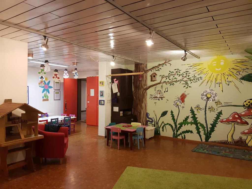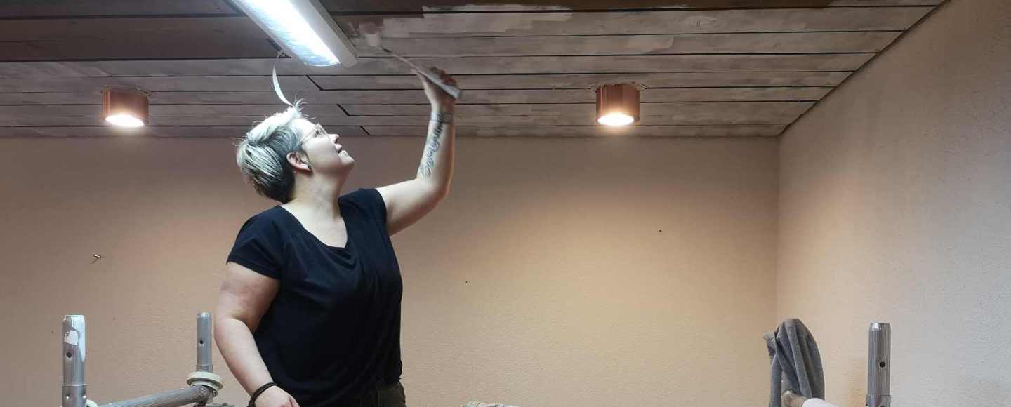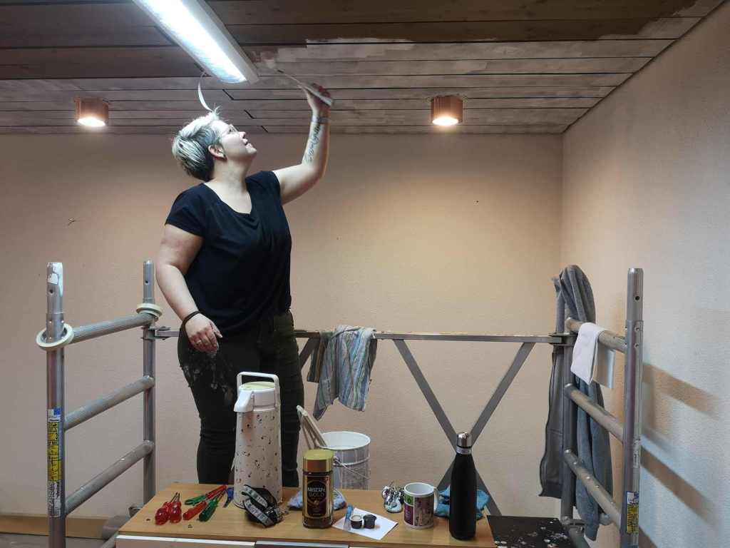 Ganz unkonventionelle Unterhaltsarbeiten finden im Spielgruppenzimmer im Untergeschoss statt. In diesem Raum, der in den Plänen des Zopfhuus als „Jugendkeller“ bezeichnet ist, ist die Spielgruppenleiterin Tanja Schulthess in die Malerhosen gestiegen und streicht grad selber die Decke und die Wände „ihres“ Raums für die Spielgruppe.