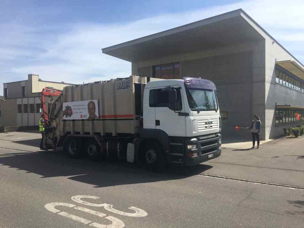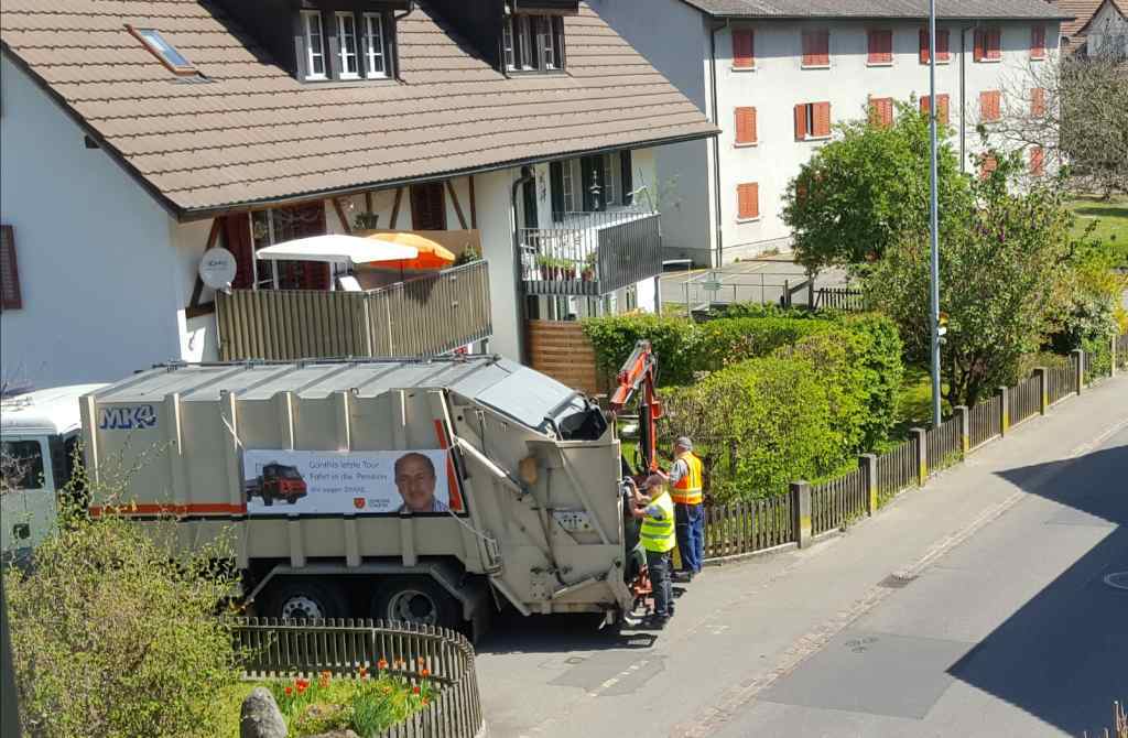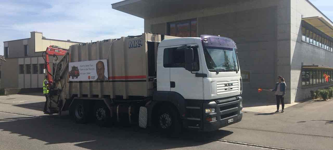 Der beschriftete Kehrichtwagen wies auf die bevorstehende Pensionierung hin. Passanten schauten dem LKW nach, der eine oder andere blieb stehen und nicht selten waren gute Worte über Günthi zu vernehmen.