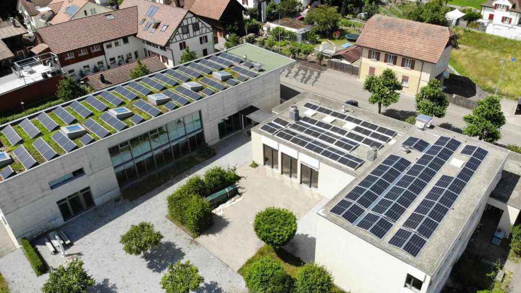 Die neue PV-Anlage auf dem Zopfhuus, links die ältere Anlage (2012) auf dem Gemeindehaus.
