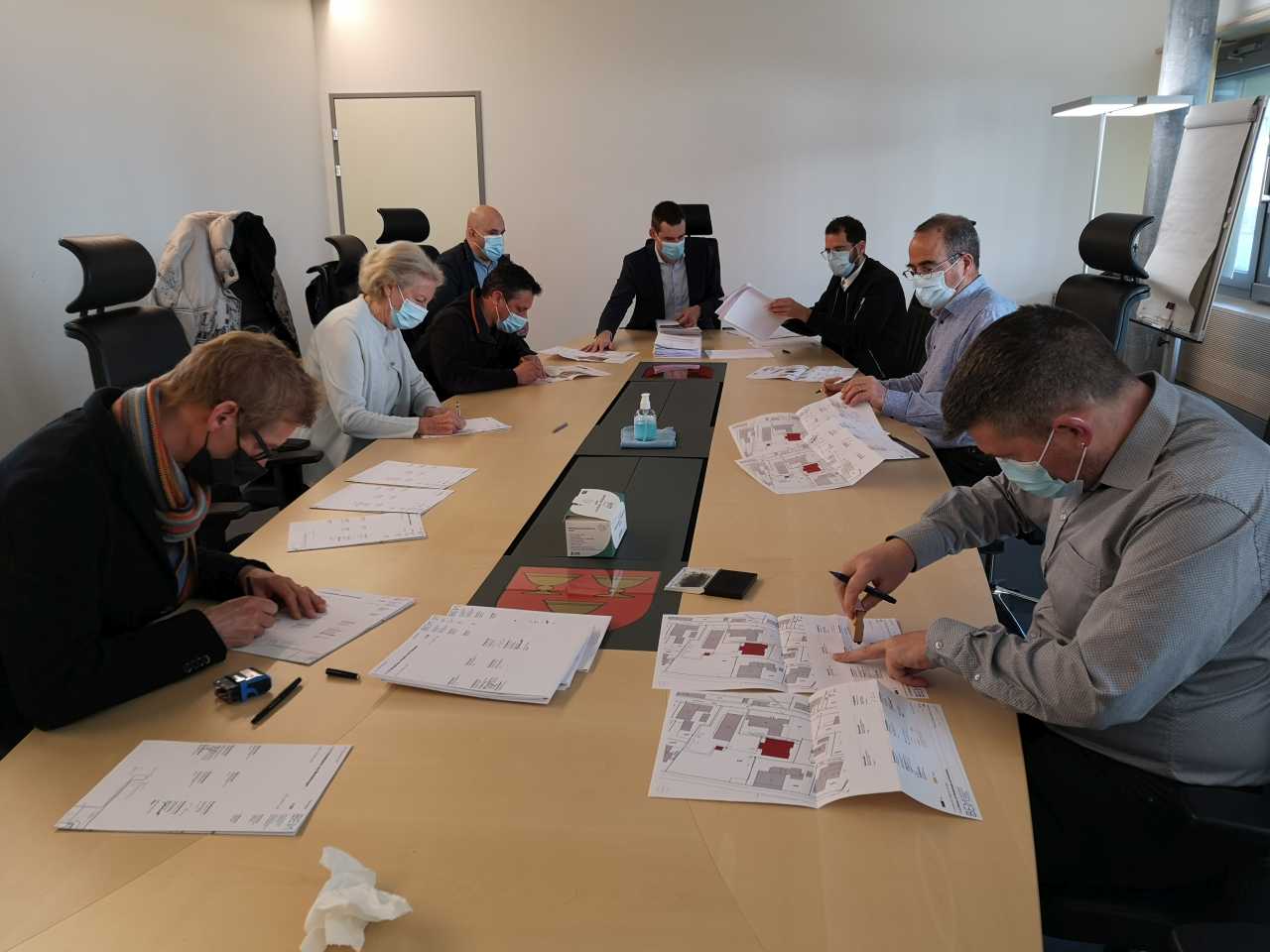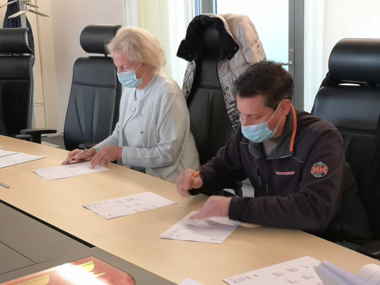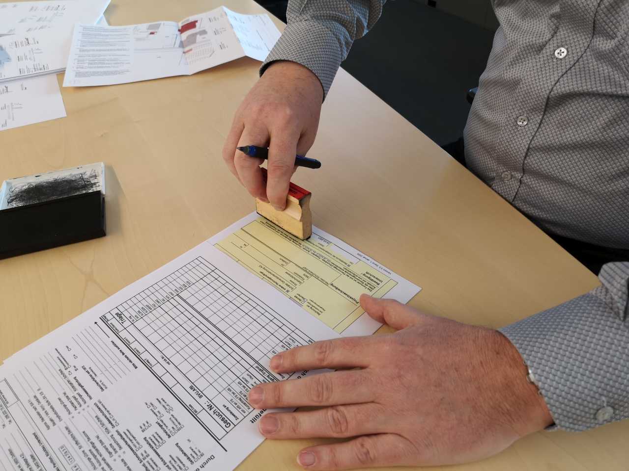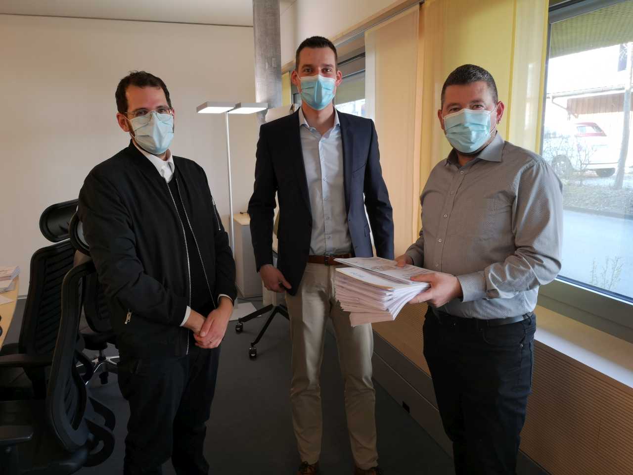 Da das Bauprojekt auch die Parzelle des Zopfhuus tangiert, haben Vertreter der Stockwerkeigentümergemeinschaft Zopfhuus, die reformierte Kirchgemeinde und die Einwohnergemeinde, ebenfalls alle Baudokumente unterzeichnet. Erst dann konnten Architekt Sandro Elmer (BEM-Architekten) und Projektleiter Gregor Notter (TU Schäfer Holzbautechnik) die Baueingabe an Gemeindeschreiber Mike Barth übergeben.