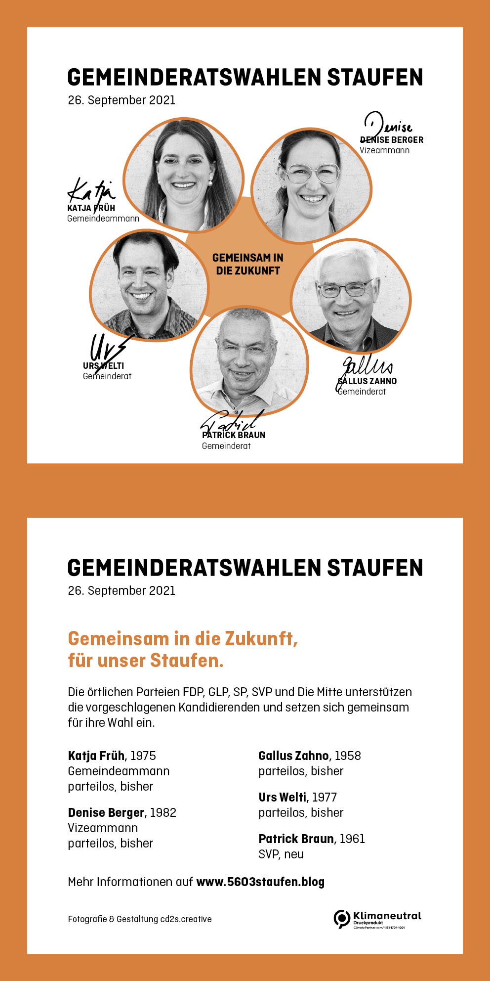 Am 26. September finden die Gemeinderatswahlen in Staufen statt. Unter dem Motto „Gemeinsam in die Zukunft – für unser Staufen“ stellen sich fünf Kandidatinnen und Kandidaten zur Verfügung, die sich für unser Dorf die nächsten vier Jahre engagieren wollen.