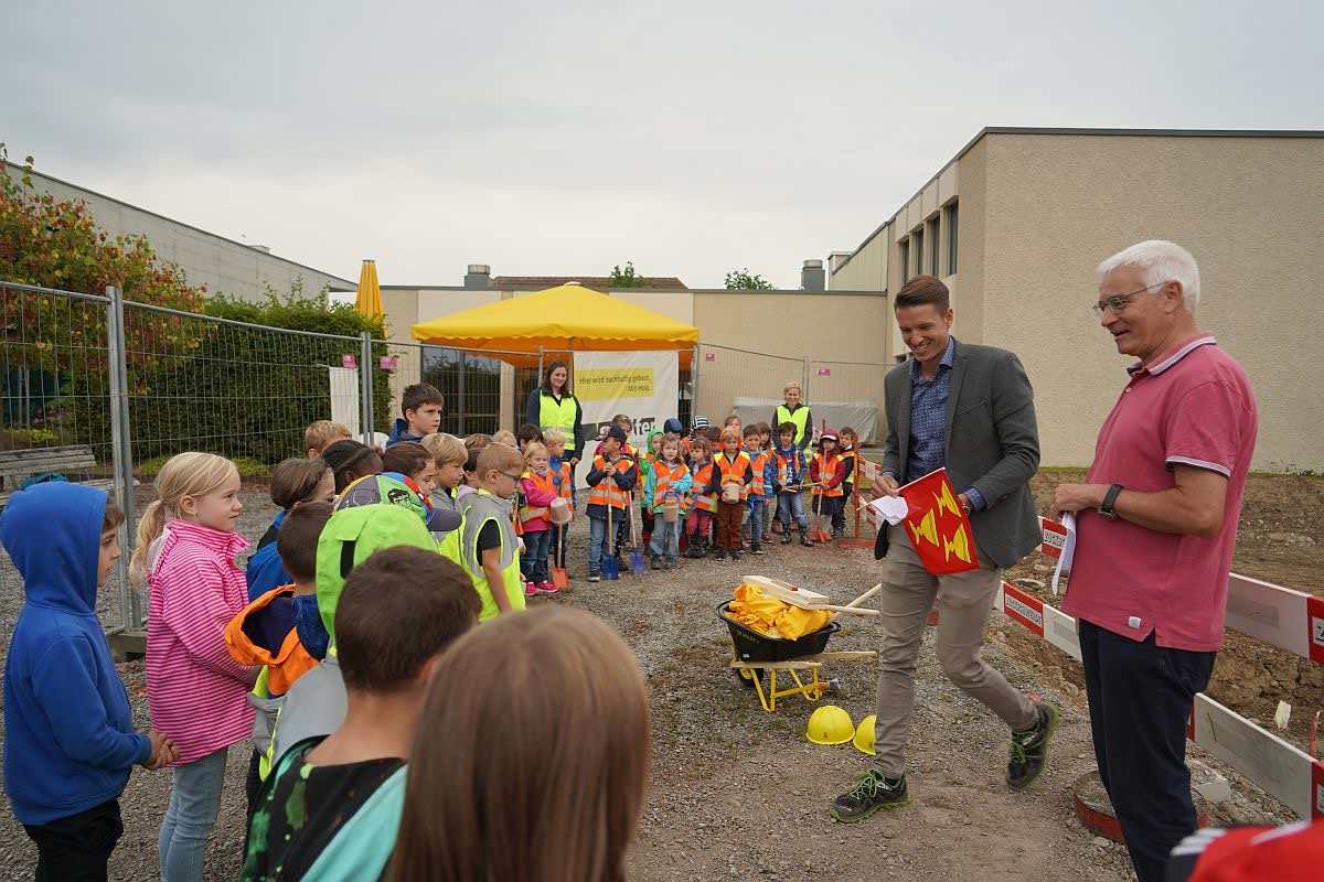 Gemeinderat Gallus Zahno stellte den Kindern den Architeken, Sandro Elmer (BEM-Architekten) und den Holzbauer Marc Huggenberger (Schäfer Holzbautechnik) vor. Er übergab dem Planer und dem Totalunternehmer je ein Staufner-Fähnli, mit der Bitte damit guten Wind für das Projekt zu machen.