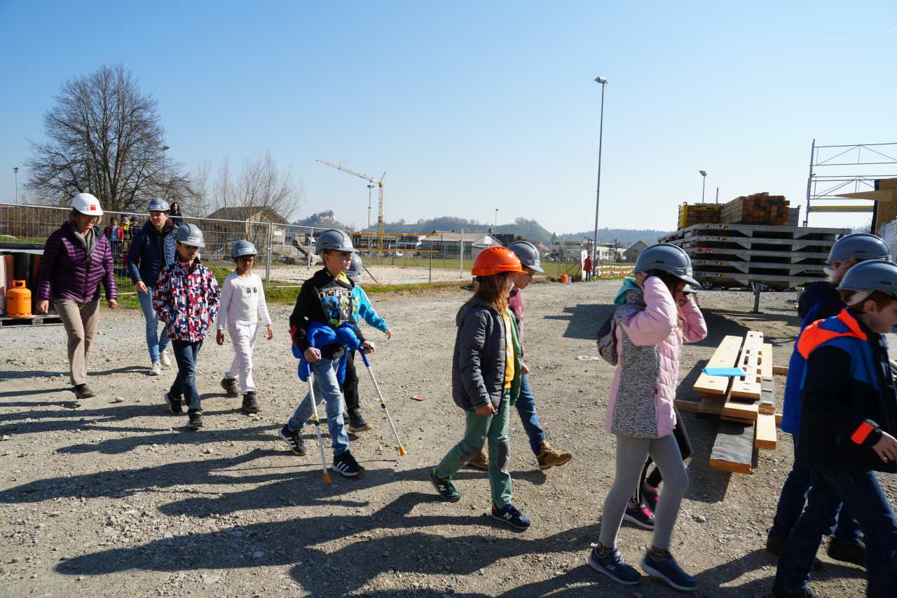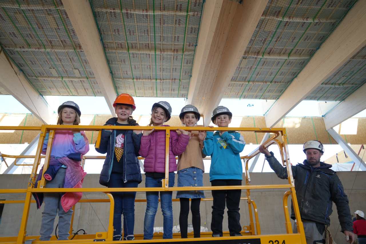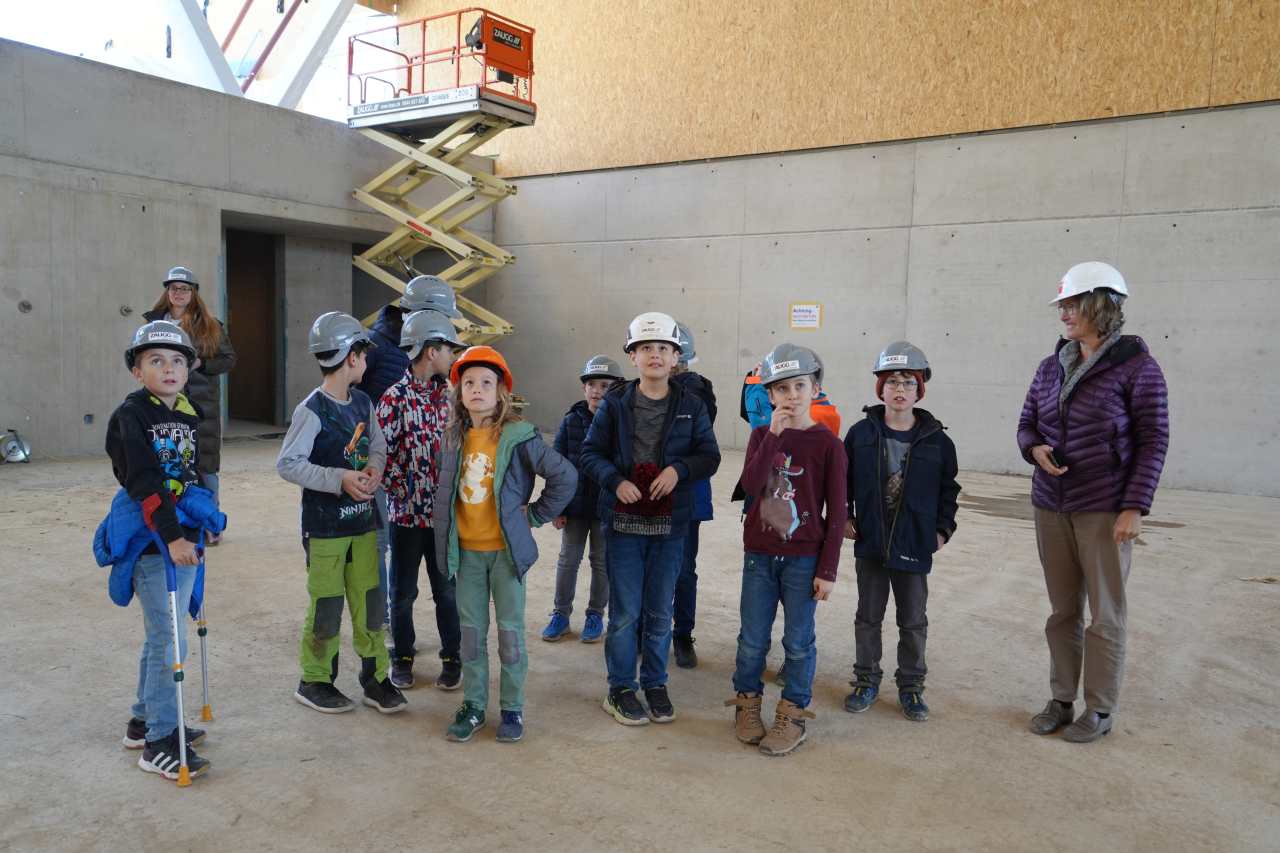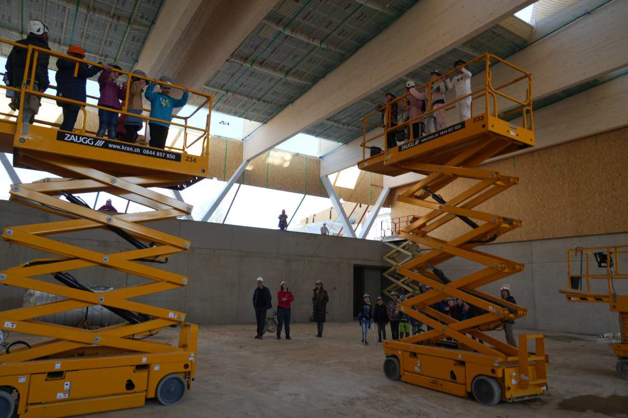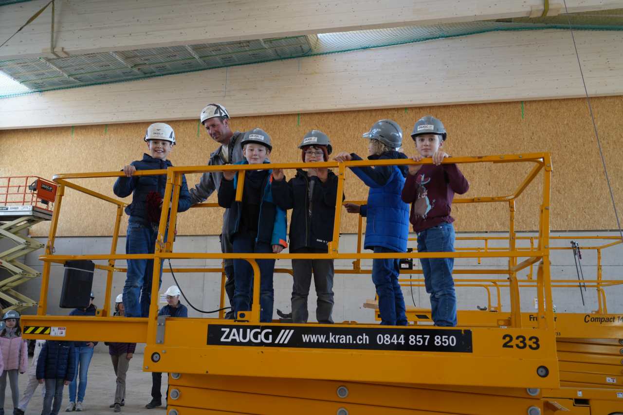 Dazwischen durften die Schülerinnen und Schüler als erste Kinder überhaupt in die Sporthalle hinuntersteigen und den Garderobenteil im Rohbau besichtigen. Und zur grossen Freude aller Beteiligten durften sie zusammen mit Zimmerleuten auf dem Lift bis zur Hallendecke hochfahren und dort die Qualität des Innendachs besichtigen.