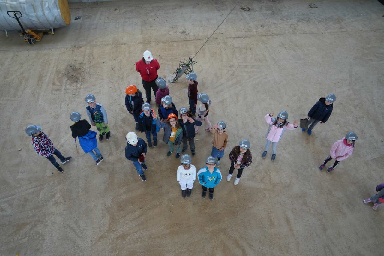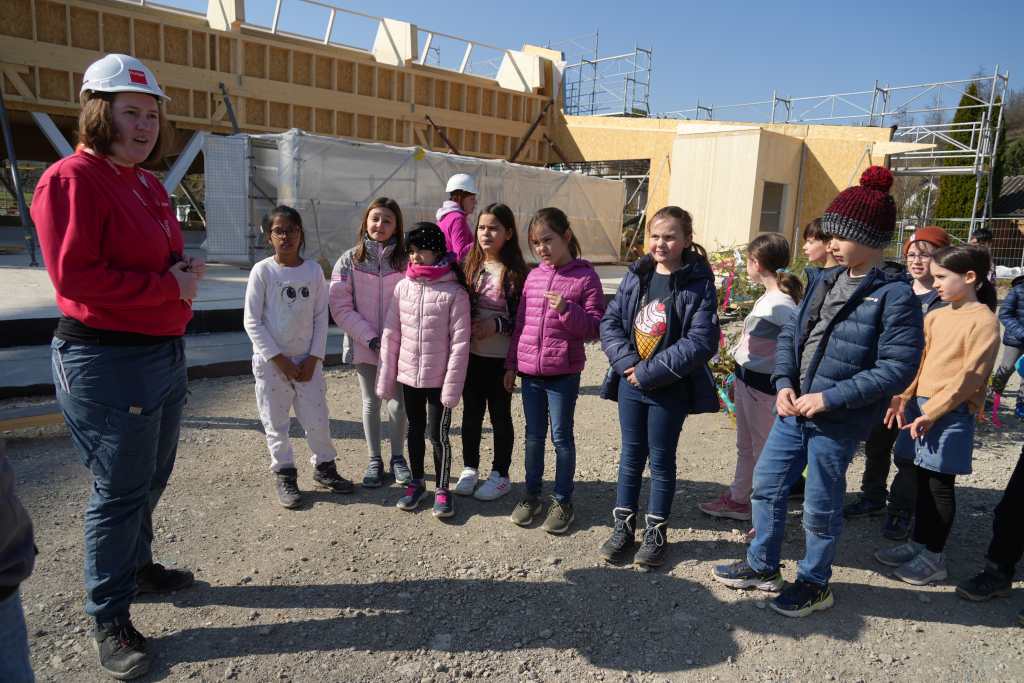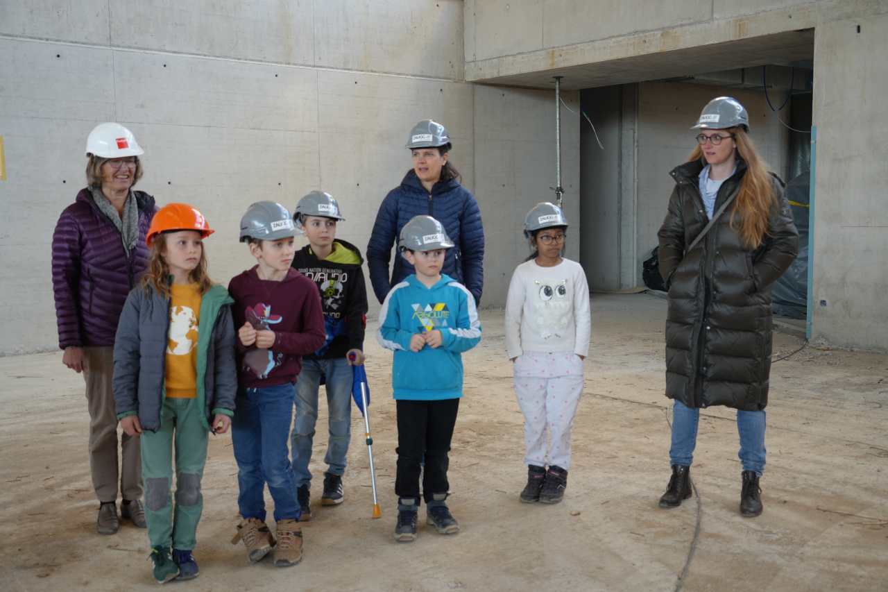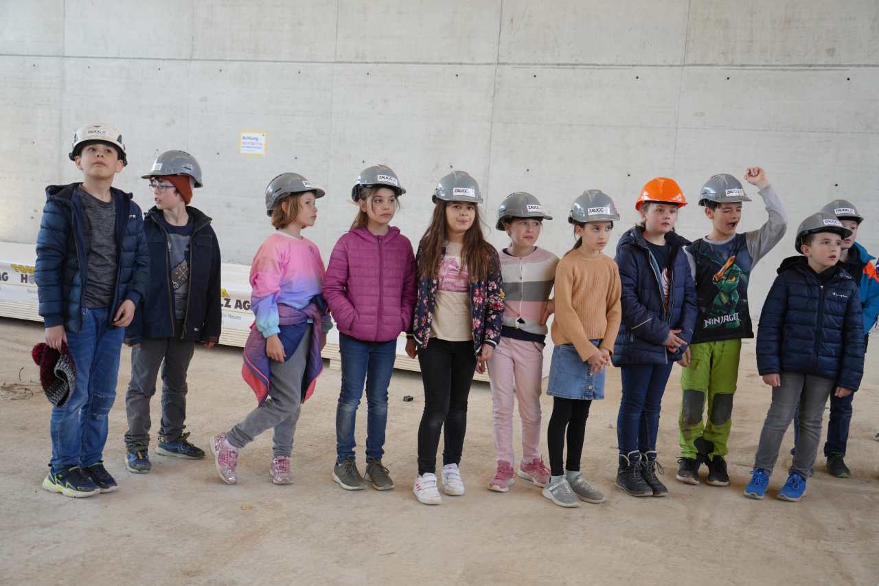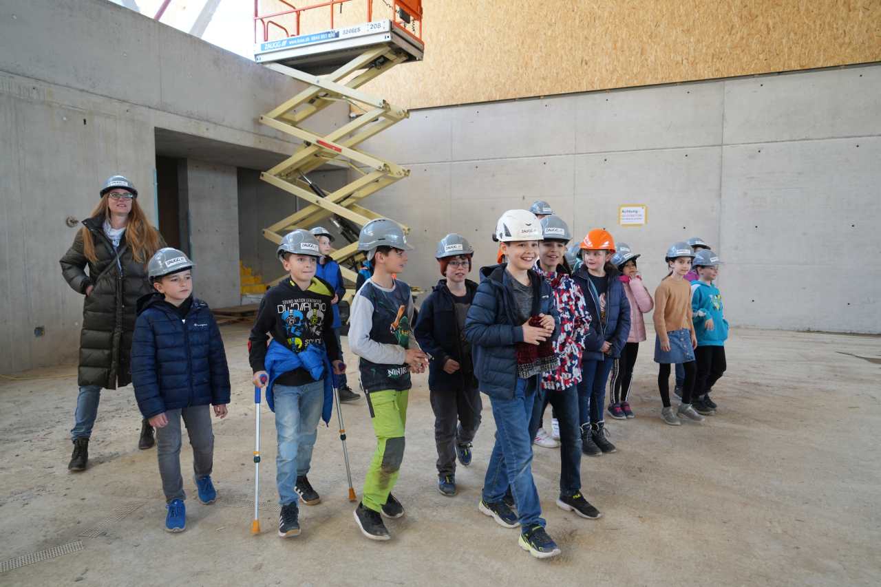 Dazwischen durften die Schülerinnen und Schüler als erste Kinder überhaupt in die Sporthalle hinuntersteigen und den Garderobenteil im Rohbau besichtigen. Und zur grossen Freude aller Beteiligten durften sie zusammen mit Zimmerleuten auf dem Lift bis zur Hallendecke hochfahren und dort die Qualität des Innendachs besichtigen.