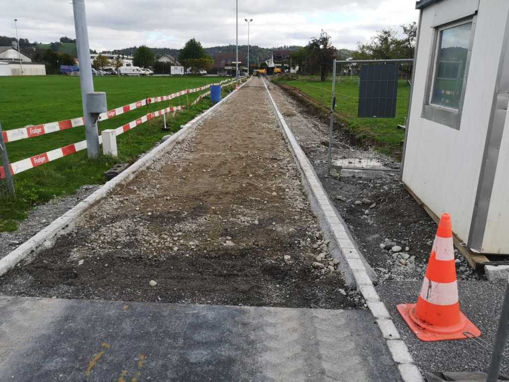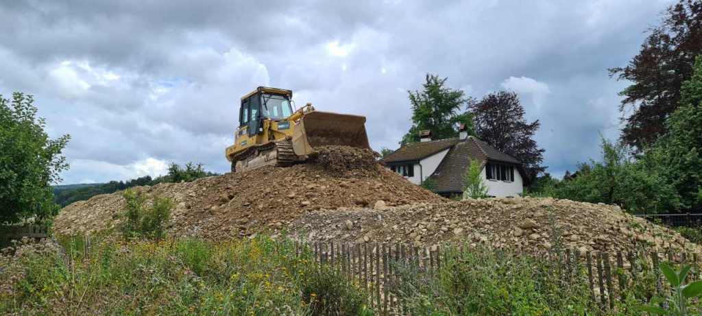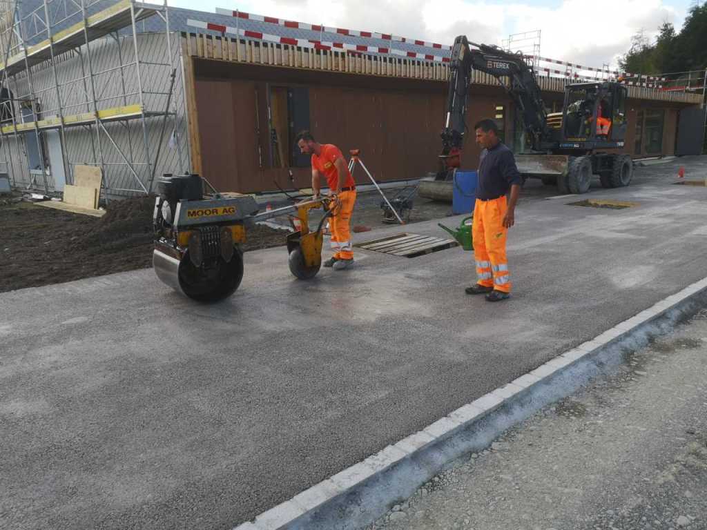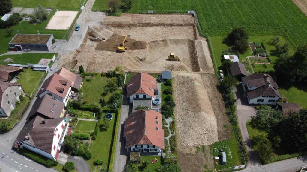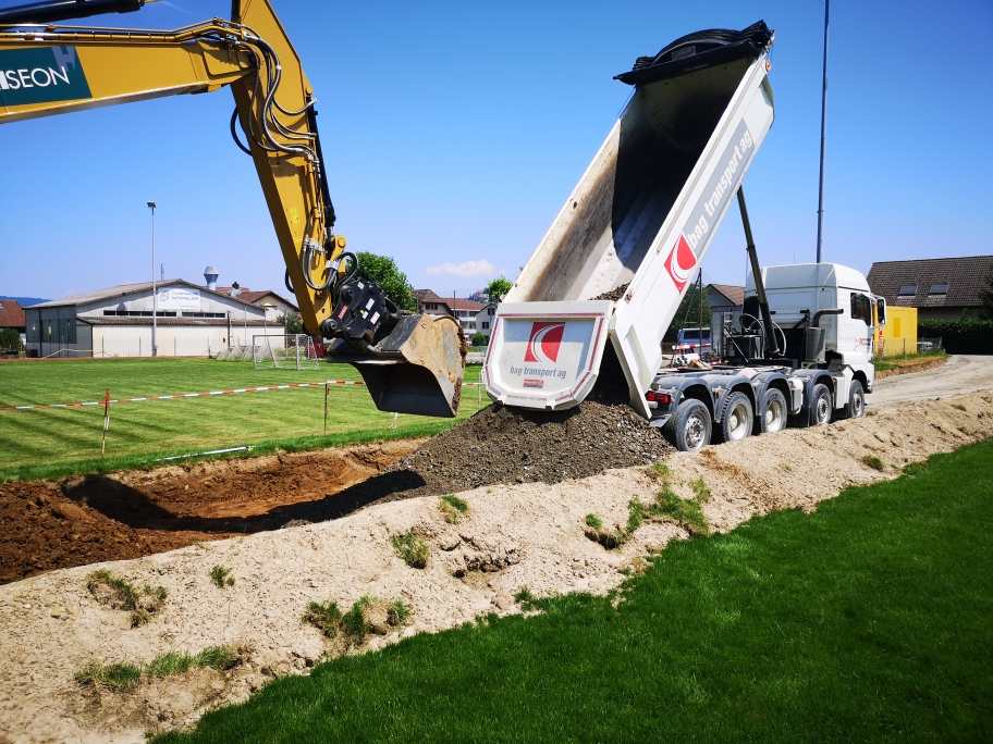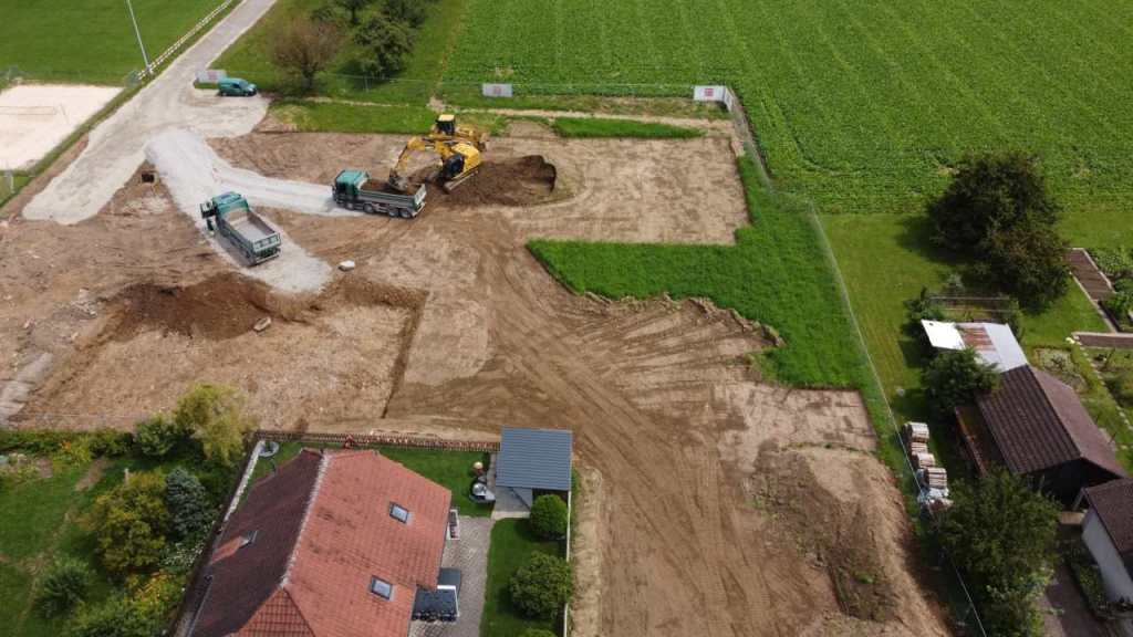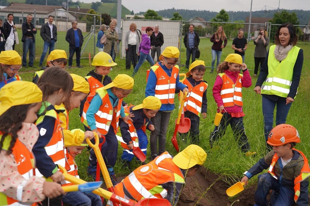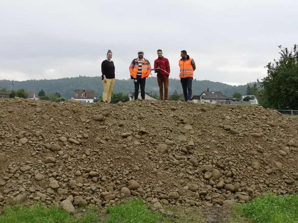 Aus dem Leben eines Baggerführers (11.08.21)Ein Kieshaufen wurde am Seenerweg für die Wiederauffüllung nach dem Bau aufgeschüttet (08.08.21)Die Bauleute von Frutiger auf dem „Feldherrenhügel“, links Bauleiterin Farida Krähenbühl (07.08.21)Das Baufeld zeichnet sich ab (Drohnenfoto 27.07.21)Baupiste (21.07.2021)Der Bau der provisorischen Baupiste zum Hermenweg gestaltet sich als nasse Angelegenheit. (Foto von Baggerführer Andreas Furrer vom 13.07.2021)Am Spatenstich am 5. Juli 2021 sind eine Klasse des Kindergartens und der Primarschule beteiligt. (Foto Mirjam Stutz)