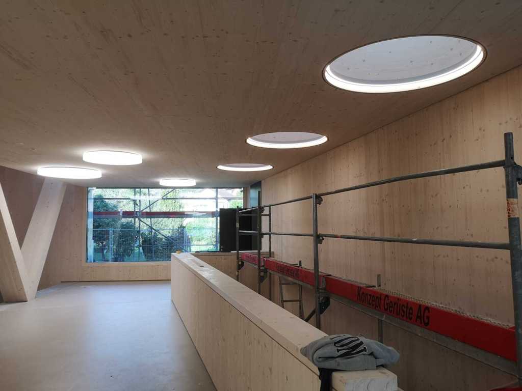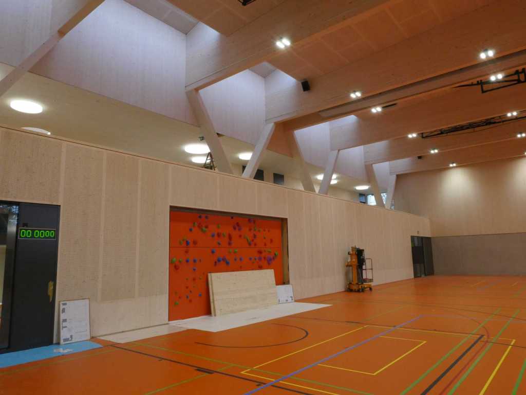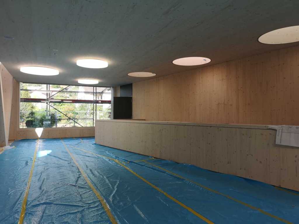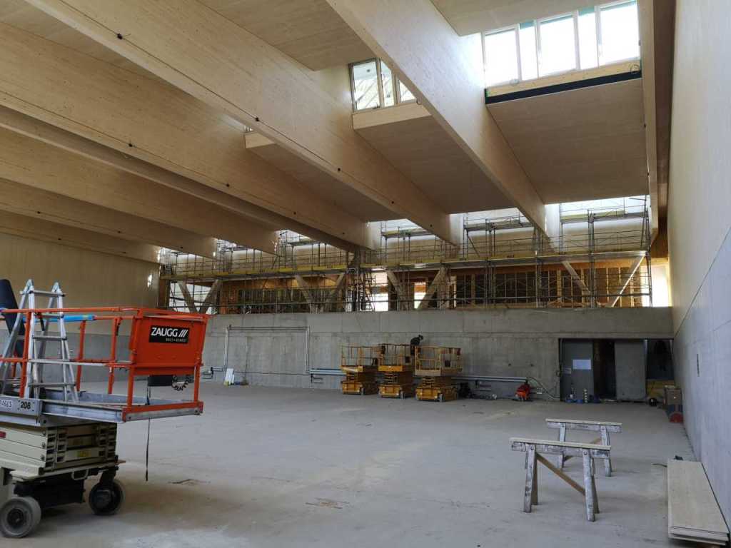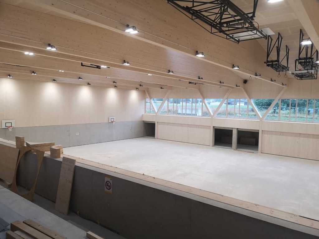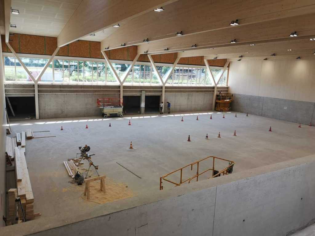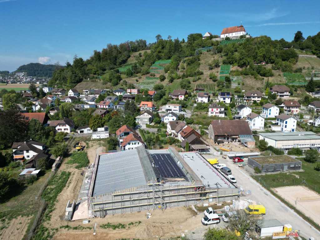 Flug durch die Sporthalle (14.10.22)Die Türe vor der Boulderwand ist montiert (07.10.22)Dachdeckerarbeiten am kleinen „Kamelbuckel“ (07.10.22)Ruhebänkli im Eingangsbereich (07.10.22)Erkennst du den Riss noch nach der Behandlung? (05.10.22)Die Bodenkosmetikerin an der Arbeit an Rissen (05.1022)Arbeiten an der Fassade der Eingangsfront (05.10.22)Durchreiche in die Teeküche (05.10.22)Das Material für den Geräteraum wurde angeliefert (03.10.22)Fuss- und Veloweg (03.10.22)Hallen aus Sicht der Geräteräume (30.09.22)Halle mit Blick auf die Tribüne und Dachkonstruktion (30.09.22)Technikraum (30.09.22)Garderobe (30.09.22)Gang zu den Garderoben mit runden Wandleuchten (30.09.22)Die Treppe von unten gesehen (30.09.22)Treppe zu den Garderoben (30.09.22)Stehtribüne (30.09.22)Foyer (30.09.22)In den letzten Tag fanden erste Vorabnahmen statt (30.09.22)Das Regenwetter der letzten Tag ist auch ein Test für die Regenwasserversickerungsanlage (29.09.22)Digitale Uhranlage, die gleichzeitig auch eine Stoppuhr ist in der Sporthalle (29.09.22)Bauleiterin Farida Krähenbühl mit einem deutschen Dachdeckergesellen in der Kluft (27.09.22)Die Hallen-Trennwand ist eingezogen (26.09.22)„Nest“ nennt sich dieser Typ Wasserabdeckung im Eingangsbereich (in Anlehnung an Herzog&De Meurons Nest-Stadion in Peking) 26.09.22Ring- und Taugeräte werden montiert (26.09.22)Dusche (26.09.22)Stand der Arbeiten beim zweiten Kamelbuckel (24.09.22)Dachfläche auf der Nordseite mit dem ersten Kamelbuckel (24.09.22)Der Bauspengler an der Arbeit bei der Fenstereinfassung (24.09.22)Blick in die Teeküche mit Durchreiche zum Foyer (24.09.22)Die Arbeiter und Maschinen der Moor AG im Einsatz auf dem Vorplatz (2309.22)Der Vorplatz wird goudroniert (23.09.22)Buebe-Toilette (2309.22)Auf der Vorderseite des Sichtschutzes in den Garderoben gibt es kleine Schränkli (23.09.22)Geräteraumeinrichtungen werden montiert (23.09.22)In den Garderoben wird der Sichtschutz montiert (22.09.22)Die Trennwand zwischen den beiden Hallen wird vor Ort genäht und montiert (22.09.22)Die Beleuchtung im Foyer mit den LED-Lichtbändern an den drei Oblichtern (22.09.22)Blick vom Duschraum zur Garderobe (20.09.22)Die Griffe der Boulderwand werden montiert (19.09.22)Im Vorfeld der Halle wird der Platz planiert (19.09.22)Die Tore zu den Geräteräumen werden montiert (19.09.22)Die WC haben nun auch Tür und Trennwände erhalten (19.09.22)WC sind montiert, wenn der Kredit reicht, gibt es noch Trennwände;-) (13.09.22)Die Bodenmarkierungen sind angebracht (12.09.22)Der PU-Boden in den Garderoben wird eingebracht (09.09.22) Foto Farida KrähenbühlDer Aussenbereich mit dem Veloweg nimmt Formen an (09.09.22)Die Teeküche im Foyer wird montiert (09.09.22)Auf dem Hallenboden werden die Markierungen vorbereitet (09.09.22)die Beleuchtung im Foyer ist montiert (07.09.22)eine weitere Schicht des Hallenbodens ist aufgetragen (07.09.22)Aussenansicht Stand 02.09.22eine weitere Schicht wird auf dem Hallenboden aufgetragen (02.09.22)Drei Oblichter beleuchten den Treppenabgang (02.09.22)Die Firma Moor ist am Vorbereiten des Zufahrtsweges für Velos und Fussgänger (01.09.22)Arbeiten an der Fassade (30.08.22)Die Brüstung der Stehtribüne ist mit einem dicken Brett abgedeckt (26.08.22)Die Sprossenwände werden montiert (26.08.22)Der Hallenboden wird gelegt (24.08.22)Die Eingangsfront wird sichtbar (23.08.22)Sicht von der Tribüne in die Halle. Stand 19.8.22Sicht von der Halle Richtung Tribüne. Stand 19.8.22Die Hebebühnen wurden aus dieser Öffnung im Geräteraum gehoben, dafür wurden bereits vier Barren hineingehievt. Die Öffnung wird wieder verschlossen. (19.08.22)Die Decke im Foyer wird durch die Zimmerleute montiert (15.08.22)Arbeiten an der Decke im Tribünenbereich (15.8.22)Auf dem Dach sind die ersten Eternitschindeln montiert (10.08.22)Die Eingangsfront und die Dachuntersicht ist bald fertig (10.08.22)Die Holzabdeckungen werden zum zweiten Mal lasiert (08.08.22)Hier werden die Griffe der Boulderwand montiert (08.08.22)Basketballanlage ist montiert (25.07.22)Die Ringanlage an der Hallendecke wird montiert (18.07.22)Blick von der Tribüne in die Halle – Fenster und Licht sind montiert (30.06.22)Dach und Fassade wären bereit für die Eternitschindeln (29.06.22)Im Foyer wird die Untersicht eingebaut (24.06.22)Im Eingangsbereich der Sporthalle (21.06.22)Wie ein Bilderrahmen wirkt das neue Fenstere gegen den Staufberg (15.06.22)Ein Türflügel wird montiert (15.06.22)Die ersten Fenster auf der Südseite sind montiert (14.06.22)Heizschlangen auf dem Hallenboden (08.06.22)Lukas Ziltener und sein Team montieren die PV-Anlage (03.06.22)Die Innenverkleidungen in der Halle sind fast fertig (30.05.22)Vorbereitungsarbeiten für die Montage der PV-Anlage (17.05.22)Die Hallendecke wird montiert (17.05.22)Dachlattung (17.05.22)Blick in die Halle Stand 12.05.22Blick von der Südseite durch die Halle auf die Tribüne (02.05.22)Aussensicht Stand 21.04.2022Die erste Dreischicht-Holzplatte der Innenwand ist montiert (21.04.22)Haustechnik: Montage Lüftung (21.04.22)Haustechnik: Wärmeverteilung (19.04.22)Haustechnik: Duschanlage (19.04.22)Arbeiten auf dem Dach (06.04.22)Der Blick von der Tribüne lässt die künftige Atmosphäre der Halle erahnen (30.03.22)Die Eingangspartie mit Vordach ist erkennbar (30.03.22)Das Dach ist eingedeckt und das Aufrichtebäumli steht (24.03.22)Das Dach wird eingedeckt (22.03.22)Alle acht Binder sind montiert (16.03.22)Die ersten fünf Binder überbrücken die Halle (15.03.22)Der erste Binder kommt geflogen… (14.03.22)Der Moment, wo der Frutiger-Kran die Kirche auf den Staufberg absetzt (13.03.22) Foto Thomas VollenweiderAm Montag, 14. März werden die Binder mit dem Pneukran auf die Y-Stützen montiert (11.03.22)Der Hilfskran steht bereit für die Montage der 30m langen Binder (11.03.22)Die Seitenwände sind aufgerichtet (11.03.22)Blick durch ein Fenster der Ostwand auf die Hostet (09.03.22)Die Y-Stützen für die grossen Binder werden montiert