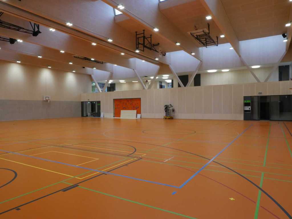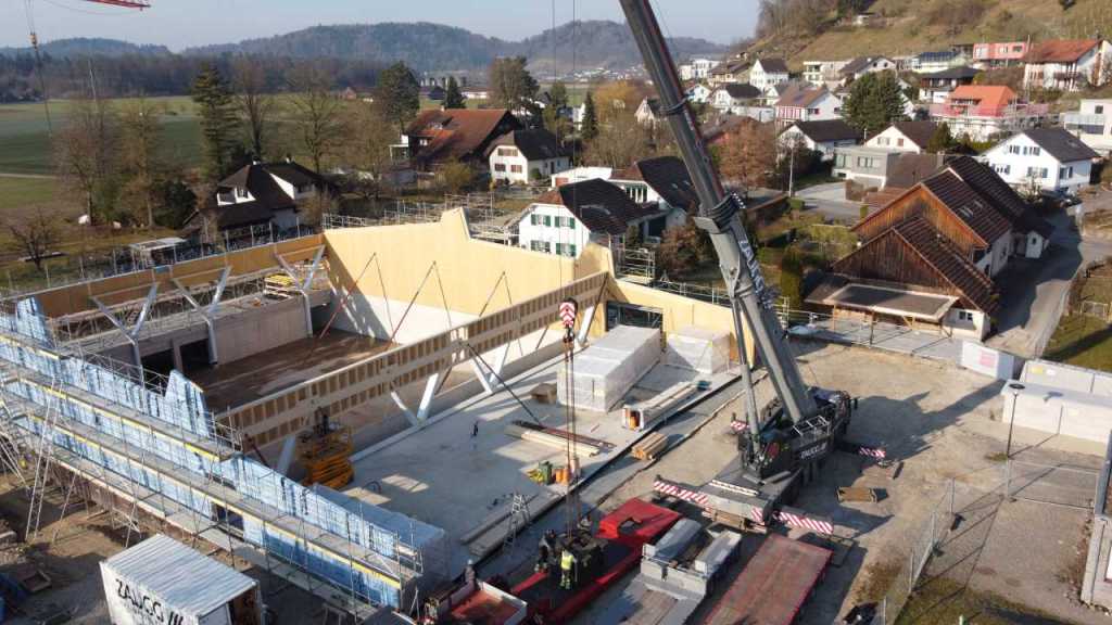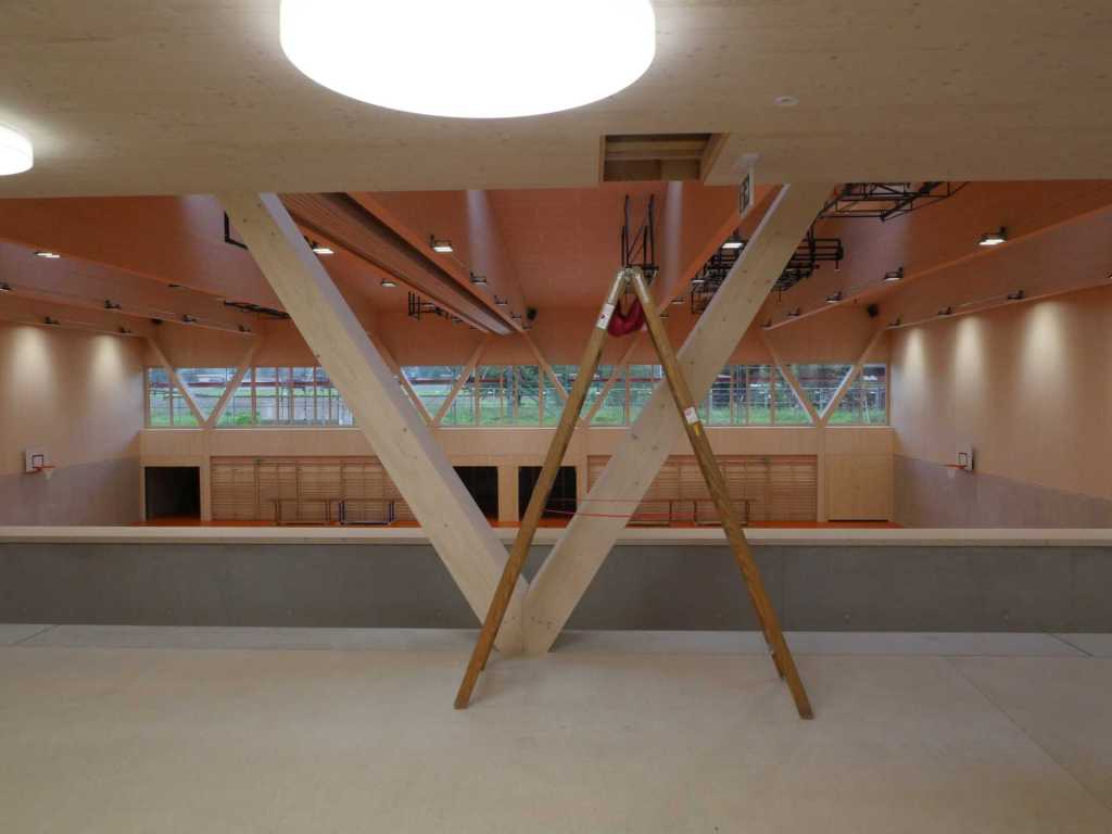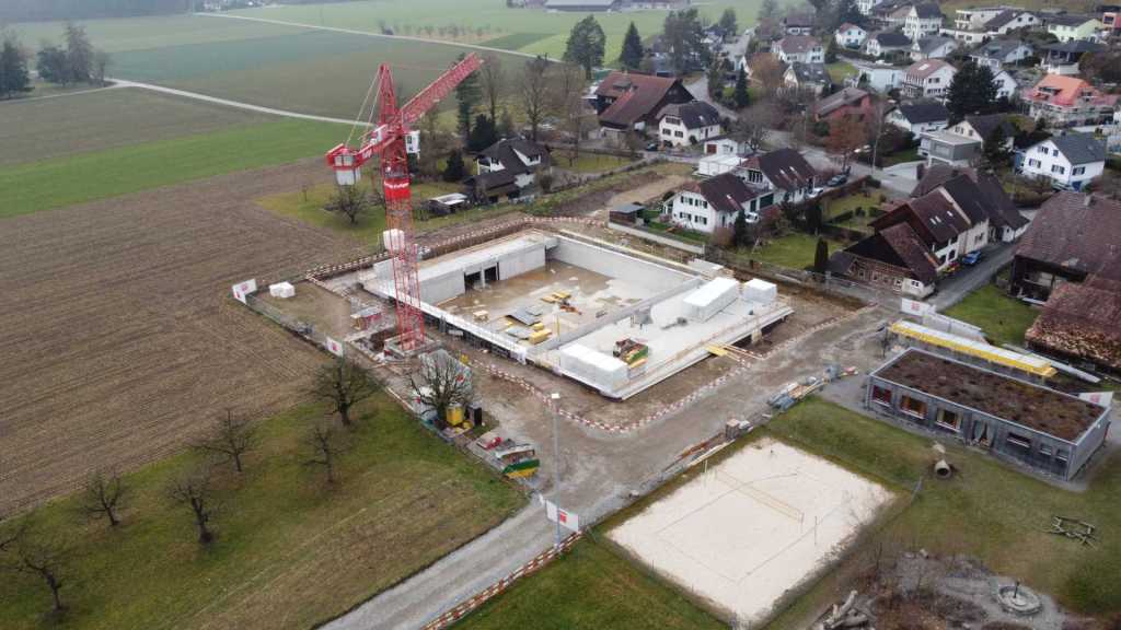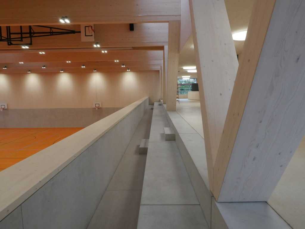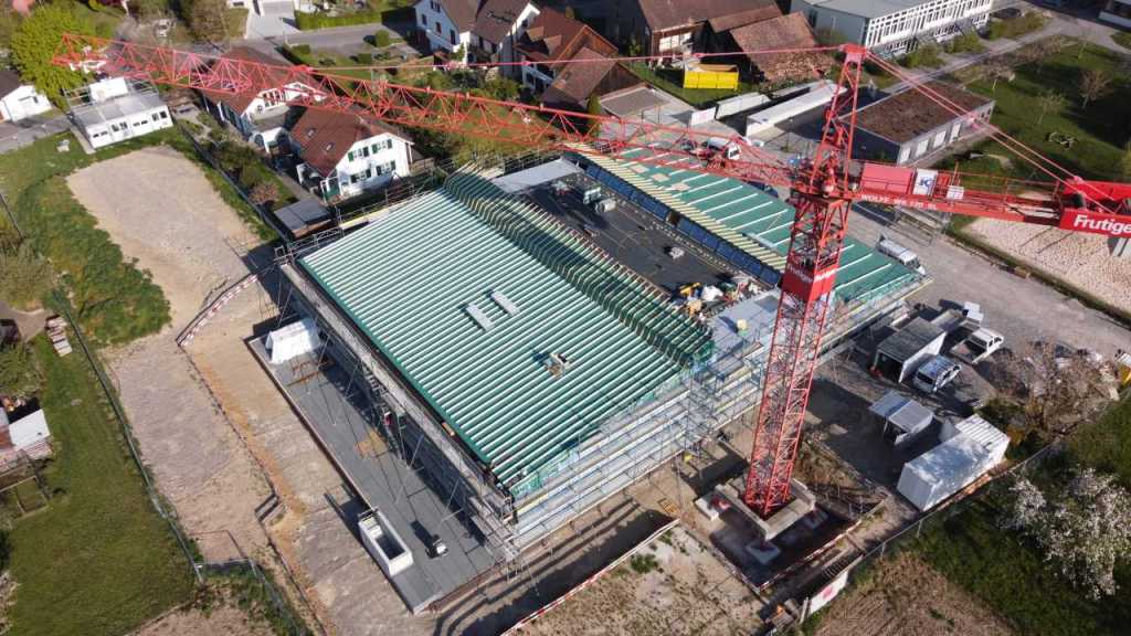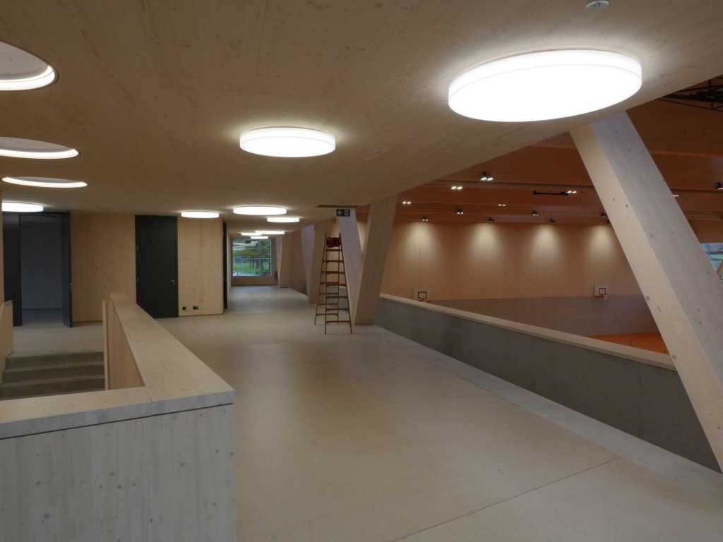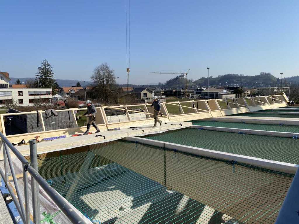Flug durch die Sporthalle (14.10.22)Die Türe vor der Boulderwand ist montiert (07.10.22)Dachdeckerarbeiten am kleinen „Kamelbuckel“ (07.10.22)Ruhebänkli im Eingangsbereich (07.10.22)Erkennst du den Riss noch nach der Behandlung? (05.10.22)Die Bodenkosmetikerin an der Arbeit an Rissen (05.1022)Arbeiten an der Fassade der Eingangsfront (05.10.22)Durchreiche in die Teeküche (05.10.22)Das Material für den Geräteraum wurde angeliefert (03.10.22)Fuss- und Veloweg (03.10.22)Hallen aus Sicht der Geräteräume (30.09.22)Halle mit Blick auf die Tribüne und Dachkonstruktion (30.09.22)Technikraum (30.09.22)Garderobe (30.09.22)Gang zu den Garderoben mit runden Wandleuchten (30.09.22)Die Treppe von unten gesehen (30.09.22)Treppe zu den Garderoben (30.09.22)Stehtribüne (30.09.22)Foyer (30.09.22)In den letzten Tag fanden erste Vorabnahmen statt (30.09.22)Das Regenwetter der letzten Tag ist auch ein Test für die Regenwasserversickerungsanlage (29.09.22)Digitale Uhranlage, die gleichzeitig auch eine Stoppuhr ist in der Sporthalle (29.09.22)Bauleiterin Farida Krähenbühl mit einem deutschen Dachdeckergesellen in der Kluft (27.09.22)Die Hallen-Trennwand ist eingezogen (26.09.22)„Nest“ nennt sich dieser Typ Wasserabdeckung im Eingangsbereich (in Anlehnung an Herzog&De Meurons Nest-Stadion in Peking) 26.09.22Ring- und Taugeräte werden montiert (26.09.22)Dusche (26.09.22)Stand der Arbeiten beim zweiten Kamelbuckel (24.09.22)Dachfläche auf der Nordseite mit dem ersten Kamelbuckel (24.09.22)Der Bauspengler an der Arbeit bei der Fenstereinfassung (24.09.22)Blick in die Teeküche mit Durchreiche zum Foyer (24.09.22)Die Arbeiter und Maschinen der Moor AG im Einsatz auf dem Vorplatz (2309.22)Der Vorplatz wird goudroniert (23.09.22)Buebe-Toilette (2309.22)Auf der Vorderseite des Sichtschutzes in den Garderoben gibt es kleine Schränkli (23.09.22)Geräteraumeinrichtungen werden montiert (23.09.22)In den Garderoben wird der Sichtschutz montiert (22.09.22)Die Trennwand zwischen den beiden Hallen wird vor Ort genäht und montiert (22.09.22)Die Beleuchtung im Foyer mit den LED-Lichtbändern an den drei Oblichtern (22.09.22)Blick vom Duschraum zur Garderobe (20.09.22)Die Griffe der Boulderwand werden montiert (19.09.22)Im Vorfeld der Halle wird der Platz planiert (19.09.22)Die Tore zu den Geräteräumen werden montiert (19.09.22)Die WC haben nun auch Tür und Trennwände erhalten (19.09.22)WC sind montiert, wenn der Kredit reicht, gibt es noch Trennwände;-) (13.09.22)Die Bodenmarkierungen sind angebracht (12.09.22)Der PU-Boden in den Garderoben wird eingebracht (09.09.22) Foto Farida KrähenbühlDer Aussenbereich mit dem Veloweg nimmt Formen an (09.09.22)Die Teeküche im Foyer wird montiert (09.09.22)Auf dem Hallenboden werden die Markierungen vorbereitet (09.09.22)die Beleuchtung im Foyer ist montiert (07.09.22)eine weitere Schicht des Hallenbodens ist aufgetragen (07.09.22)Aussenansicht Stand 02.09.22eine weitere Schicht wird auf dem Hallenboden aufgetragen (02.09.22)Drei Oblichter beleuchten den Treppenabgang (02.09.22)Die Firma Moor ist am Vorbereiten des Zufahrtsweges für Velos und Fussgänger (01.09.22)Arbeiten an der Fassade (30.08.22)Die Brüstung der Stehtribüne ist mit einem dicken Brett abgedeckt (26.08.22)Die Sprossenwände werden montiert (26.08.22)Der Hallenboden wird gelegt (24.08.22)Die Eingangsfront wird sichtbar (23.08.22)Sicht von der Tribüne in die Halle. Stand 19.8.22Sicht von der Halle Richtung Tribüne. Stand 19.8.22Die Hebebühnen wurden aus dieser Öffnung im Geräteraum gehoben, dafür wurden bereits vier Barren hineingehievt. Die Öffnung wird wieder verschlossen. (19.08.22)Die Decke im Foyer wird durch die Zimmerleute montiert (15.08.22)Arbeiten an der Decke im Tribünenbereich (15.8.22)Auf dem Dach sind die ersten Eternitschindeln montiert (10.08.22)Die Eingangsfront und die Dachuntersicht ist bald fertig (10.08.22)Die Holzabdeckungen werden zum zweiten Mal lasiert (08.08.22)Hier werden die Griffe der Boulderwand montiert (08.08.22)Basketballanlage ist montiert (25.07.22)Die Ringanlage an der Hallendecke wird montiert (18.07.22)Blick von der Tribüne in die Halle – Fenster und Licht sind montiert (30.06.22)Dach und Fassade wären bereit für die Eternitschindeln (29.06.22)Im Foyer wird die Untersicht eingebaut (24.06.22)Im Eingangsbereich der Sporthalle (21.06.22)Wie ein Bilderrahmen wirkt das neue Fenstere gegen den Staufberg (15.06.22)Ein Türflügel wird montiert (15.06.22)Die ersten Fenster auf der Südseite sind montiert (14.06.22)Heizschlangen auf dem Hallenboden (08.06.22)Lukas Ziltener und sein Team montieren die PV-Anlage (03.06.22)Die Innenverkleidungen in der Halle sind fast fertig (30.05.22)Vorbereitungsarbeiten für die Montage der PV-Anlage (17.05.22)Die Hallendecke wird montiert (17.05.22)Dachlattung (17.05.22)Blick in die Halle Stand 12.05.22Blick von der Südseite durch die Halle auf die Tribüne (02.05.22)Aussensicht Stand 21.04.2022Die erste Dreischicht-Holzplatte der Innenwand ist montiert (21.04.22)Haustechnik: Montage Lüftung (21.04.22)Haustechnik: Wärmeverteilung (19.04.22)Haustechnik: Duschanlage (19.04.22)Arbeiten auf dem Dach (06.04.22)Der Blick von der Tribüne lässt die künftige Atmosphäre der Halle erahnen (30.03.22)Die Eingangspartie mit Vordach ist erkennbar (30.03.22)Das Dach ist eingedeckt und das Aufrichtebäumli steht (24.03.22)Das Dach wird eingedeckt (22.03.22)Alle acht Binder sind montiert (16.03.22)Die ersten fünf Binder überbrücken die Halle (15.03.22)Der erste Binder kommt geflogen… (14.03.22)Der Moment, wo der Frutiger-Kran die Kirche auf den Staufberg absetzt (13.03.22) Foto Thomas VollenweiderAm Montag, 14. März werden die Binder mit dem Pneukran auf die Y-Stützen montiert (11.03.22)Der Hilfskran steht bereit für die Montage der 30m langen Binder (11.03.22)Die Seitenwände sind aufgerichtet (11.03.22)Blick durch ein Fenster der Ostwand auf die Hostet (09.03.22)Die Y-Stützen für die grossen Binder werden montiert