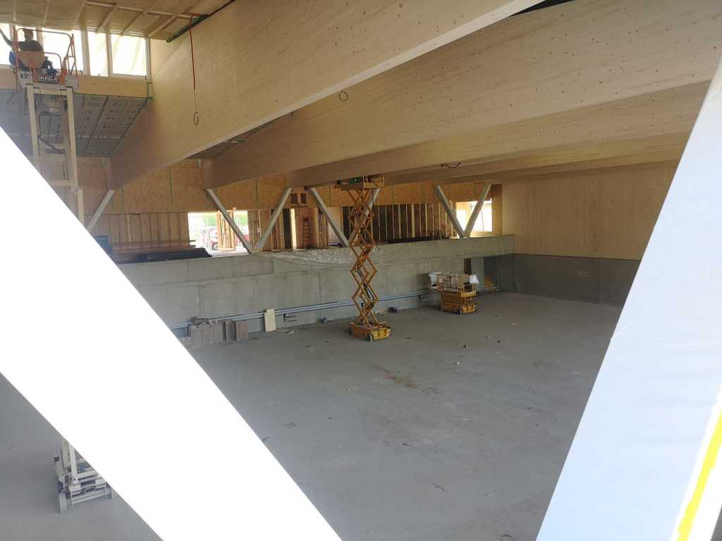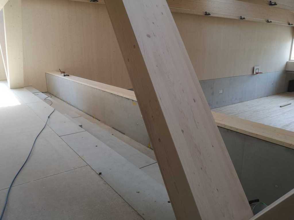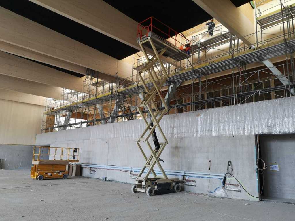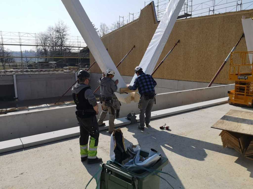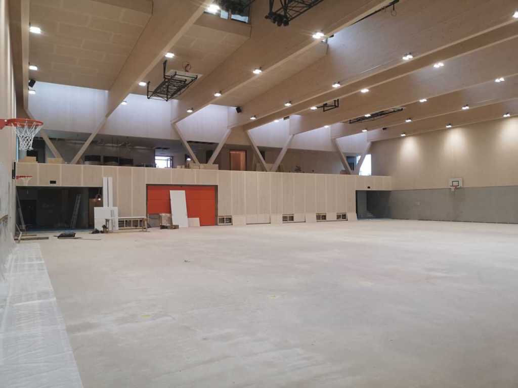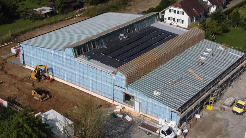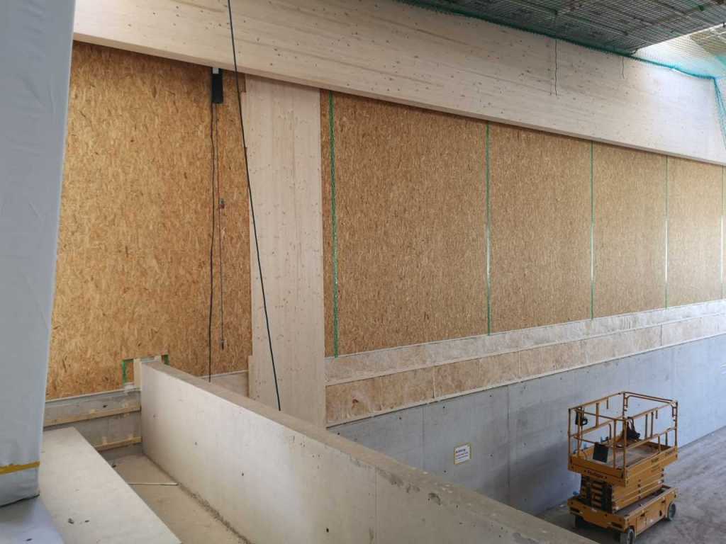 Flug durch die Sporthalle (14.10.22)Die Türe vor der Boulderwand ist montiert (07.10.22)Dachdeckerarbeiten am kleinen „Kamelbuckel“ (07.10.22)Ruhebänkli im Eingangsbereich (07.10.22)Erkennst du den Riss noch nach der Behandlung? (05.10.22)Die Bodenkosmetikerin an der Arbeit an Rissen (05.1022)Arbeiten an der Fassade der Eingangsfront (05.10.22)Durchreiche in die Teeküche (05.10.22)Das Material für den Geräteraum wurde angeliefert (03.10.22)Fuss- und Veloweg (03.10.22)Hallen aus Sicht der Geräteräume (30.09.22)Halle mit Blick auf die Tribüne und Dachkonstruktion (30.09.22)Technikraum (30.09.22)Garderobe (30.09.22)Gang zu den Garderoben mit runden Wandleuchten (30.09.22)Die Treppe von unten gesehen (30.09.22)Treppe zu den Garderoben (30.09.22)Stehtribüne (30.09.22)Foyer (30.09.22)In den letzten Tag fanden erste Vorabnahmen statt (30.09.22)Das Regenwetter der letzten Tag ist auch ein Test für die Regenwasserversickerungsanlage (29.09.22)Digitale Uhranlage, die gleichzeitig auch eine Stoppuhr ist in der Sporthalle (29.09.22)Bauleiterin Farida Krähenbühl mit einem deutschen Dachdeckergesellen in der Kluft (27.09.22)Die Hallen-Trennwand ist eingezogen (26.09.22)„Nest“ nennt sich dieser Typ Wasserabdeckung im Eingangsbereich (in Anlehnung an Herzog&De Meurons Nest-Stadion in Peking) 26.09.22Ring- und Taugeräte werden montiert (26.09.22)Dusche (26.09.22)Stand der Arbeiten beim zweiten Kamelbuckel (24.09.22)Dachfläche auf der Nordseite mit dem ersten Kamelbuckel (24.09.22)Der Bauspengler an der Arbeit bei der Fenstereinfassung (24.09.22)Blick in die Teeküche mit Durchreiche zum Foyer (24.09.22)Die Arbeiter und Maschinen der Moor AG im Einsatz auf dem Vorplatz (2309.22)Der Vorplatz wird goudroniert (23.09.22)Buebe-Toilette (2309.22)Auf der Vorderseite des Sichtschutzes in den Garderoben gibt es kleine Schränkli (23.09.22)Geräteraumeinrichtungen werden montiert (23.09.22)In den Garderoben wird der Sichtschutz montiert (22.09.22)Die Trennwand zwischen den beiden Hallen wird vor Ort genäht und montiert (22.09.22)Die Beleuchtung im Foyer mit den LED-Lichtbändern an den drei Oblichtern (22.09.22)Blick vom Duschraum zur Garderobe (20.09.22)Die Griffe der Boulderwand werden montiert (19.09.22)Im Vorfeld der Halle wird der Platz planiert (19.09.22)Die Tore zu den Geräteräumen werden montiert (19.09.22)Die WC haben nun auch Tür und Trennwände erhalten (19.09.22)WC sind montiert, wenn der Kredit reicht, gibt es noch Trennwände;-) (13.09.22)Die Bodenmarkierungen sind angebracht (12.09.22)Der PU-Boden in den Garderoben wird eingebracht (09.09.22) Foto Farida KrähenbühlDer Aussenbereich mit dem Veloweg nimmt Formen an (09.09.22)Die Teeküche im Foyer wird montiert (09.09.22)Auf dem Hallenboden werden die Markierungen vorbereitet (09.09.22)die Beleuchtung im Foyer ist montiert (07.09.22)eine weitere Schicht des Hallenbodens ist aufgetragen (07.09.22)Aussenansicht Stand 02.09.22eine weitere Schicht wird auf dem Hallenboden aufgetragen (02.09.22)Drei Oblichter beleuchten den Treppenabgang (02.09.22)Die Firma Moor ist am Vorbereiten des Zufahrtsweges für Velos und Fussgänger (01.09.22)Arbeiten an der Fassade (30.08.22)Die Brüstung der Stehtribüne ist mit einem dicken Brett abgedeckt (26.08.22)Die Sprossenwände werden montiert (26.08.22)Der Hallenboden wird gelegt (24.08.22)Die Eingangsfront wird sichtbar (23.08.22)Sicht von der Tribüne in die Halle. Stand 19.8.22Sicht von der Halle Richtung Tribüne. Stand 19.8.22Die Hebebühnen wurden aus dieser Öffnung im Geräteraum gehoben, dafür wurden bereits vier Barren hineingehievt. Die Öffnung wird wieder verschlossen. (19.08.22)Die Decke im Foyer wird durch die Zimmerleute montiert (15.08.22)Arbeiten an der Decke im Tribünenbereich (15.8.22)Auf dem Dach sind die ersten Eternitschindeln montiert (10.08.22)Die Eingangsfront und die Dachuntersicht ist bald fertig (10.08.22)Die Holzabdeckungen werden zum zweiten Mal lasiert (08.08.22)Hier werden die Griffe der Boulderwand montiert (08.08.22)Basketballanlage ist montiert (25.07.22)Die Ringanlage an der Hallendecke wird montiert (18.07.22)Blick von der Tribüne in die Halle – Fenster und Licht sind montiert (30.06.22)Dach und Fassade wären bereit für die Eternitschindeln (29.06.22)Im Foyer wird die Untersicht eingebaut (24.06.22)Im Eingangsbereich der Sporthalle (21.06.22)Wie ein Bilderrahmen wirkt das neue Fenstere gegen den Staufberg (15.06.22)Ein Türflügel wird montiert (15.06.22)Die ersten Fenster auf der Südseite sind montiert (14.06.22)Heizschlangen auf dem Hallenboden (08.06.22)Lukas Ziltener und sein Team montieren die PV-Anlage (03.06.22)Die Innenverkleidungen in der Halle sind fast fertig (30.05.22)Vorbereitungsarbeiten für die Montage der PV-Anlage (17.05.22)Die Hallendecke wird montiert (17.05.22)Dachlattung (17.05.22)Blick in die Halle Stand 12.05.22Blick von der Südseite durch die Halle auf die Tribüne (02.05.22)Aussensicht Stand 21.04.2022Die erste Dreischicht-Holzplatte der Innenwand ist montiert (21.04.22)Haustechnik: Montage Lüftung (21.04.22)Haustechnik: Wärmeverteilung (19.04.22)Haustechnik: Duschanlage (19.04.22)Arbeiten auf dem Dach (06.04.22)Der Blick von der Tribüne lässt die künftige Atmosphäre der Halle erahnen (30.03.22)Die Eingangspartie mit Vordach ist erkennbar (30.03.22)Das Dach ist eingedeckt und das Aufrichtebäumli steht (24.03.22)Das Dach wird eingedeckt (22.03.22)Alle acht Binder sind montiert (16.03.22)Die ersten fünf Binder überbrücken die Halle (15.03.22)Der erste Binder kommt geflogen… (14.03.22)Der Moment, wo der Frutiger-Kran die Kirche auf den Staufberg absetzt (13.03.22) Foto Thomas VollenweiderAm Montag, 14. März werden die Binder mit dem Pneukran auf die Y-Stützen montiert (11.03.22)Der Hilfskran steht bereit für die Montage der 30m langen Binder (11.03.22)Die Seitenwände sind aufgerichtet (11.03.22)Blick durch ein Fenster der Ostwand auf die Hostet (09.03.22)Die Y-Stützen für die grossen Binder werden montiert