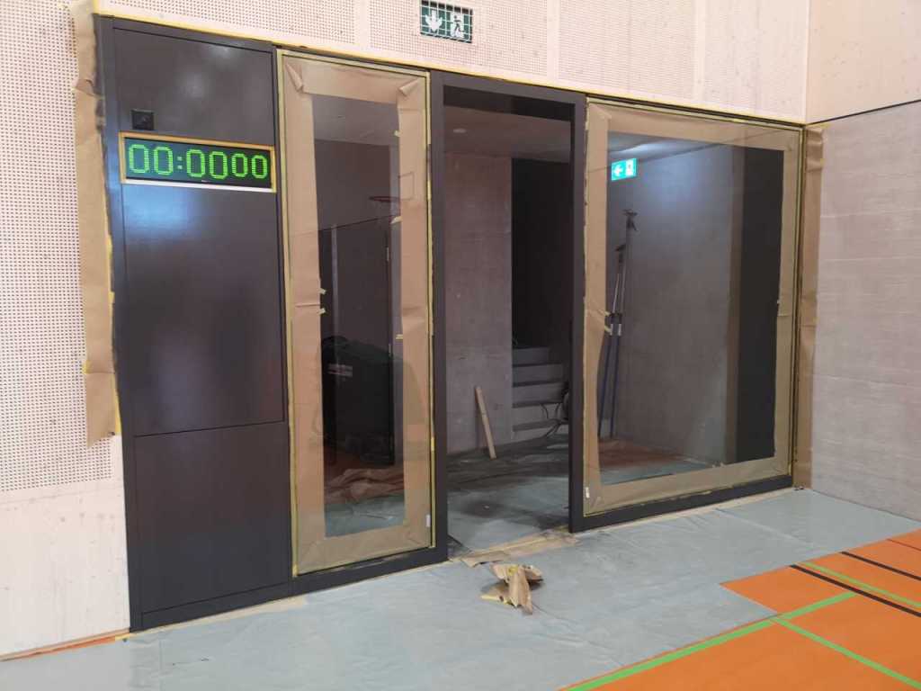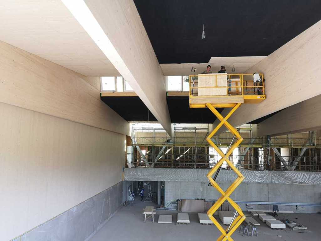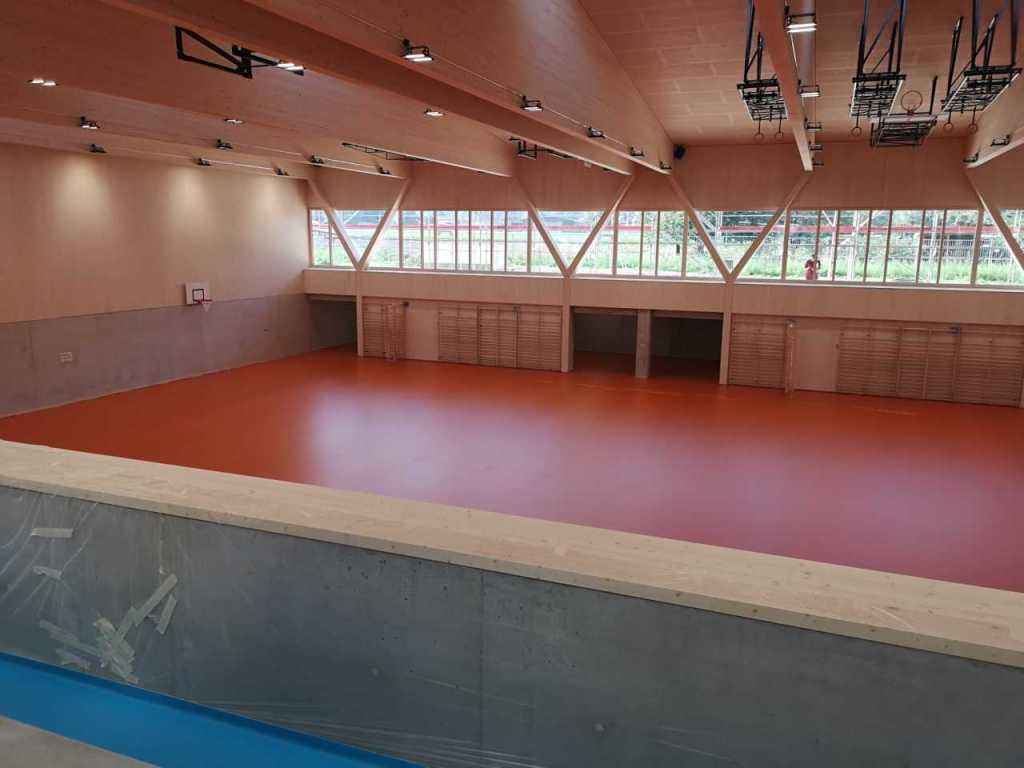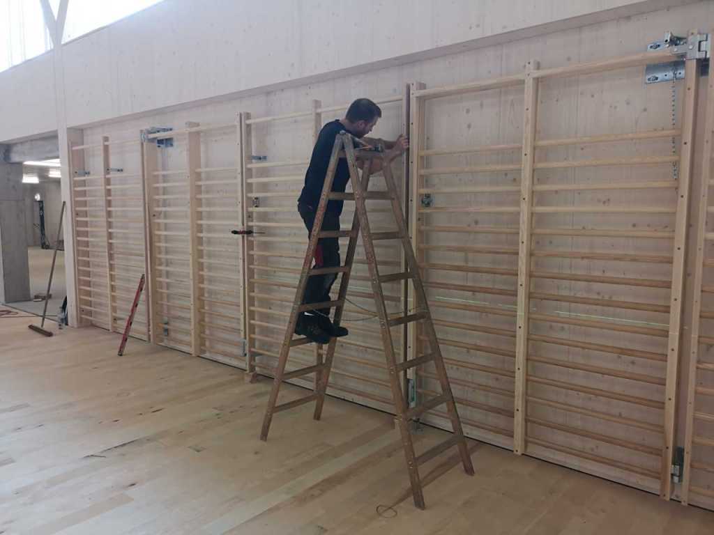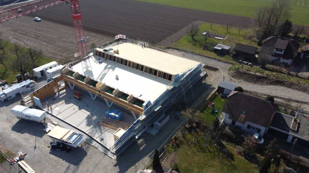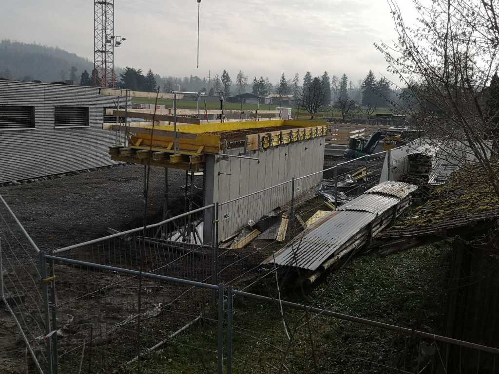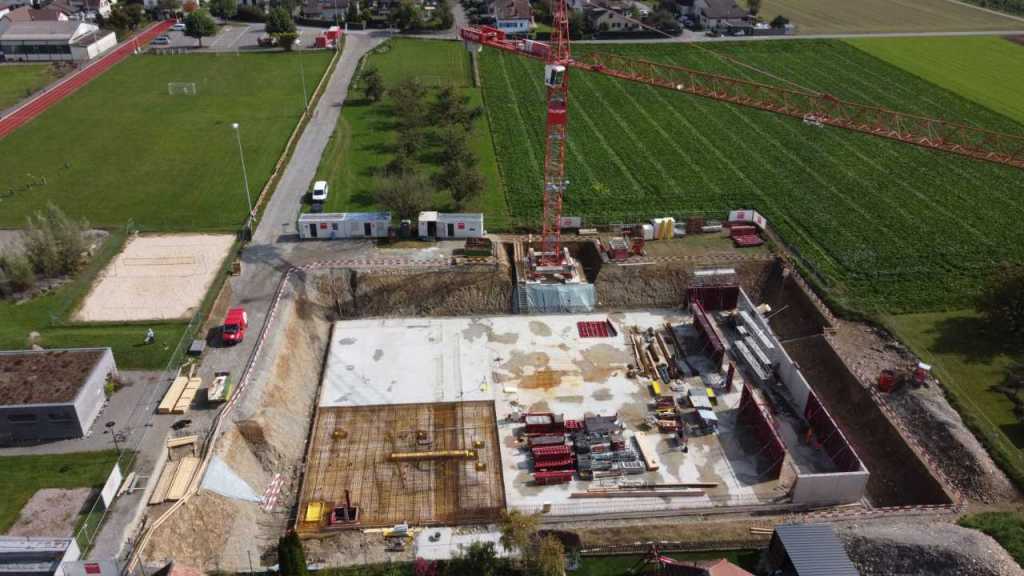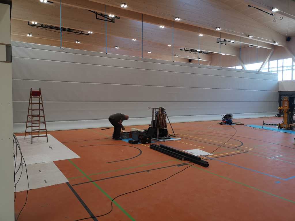 Flug durch die Sporthalle (14.10.22)Die Türe vor der Boulderwand ist montiert (07.10.22)Dachdeckerarbeiten am kleinen „Kamelbuckel“ (07.10.22)Ruhebänkli im Eingangsbereich (07.10.22)Erkennst du den Riss noch nach der Behandlung? (05.10.22)Die Bodenkosmetikerin an der Arbeit an Rissen (05.1022)Arbeiten an der Fassade der Eingangsfront (05.10.22)Durchreiche in die Teeküche (05.10.22)Das Material für den Geräteraum wurde angeliefert (03.10.22)Fuss- und Veloweg (03.10.22)Hallen aus Sicht der Geräteräume (30.09.22)Halle mit Blick auf die Tribüne und Dachkonstruktion (30.09.22)Technikraum (30.09.22)Garderobe (30.09.22)Gang zu den Garderoben mit runden Wandleuchten (30.09.22)Die Treppe von unten gesehen (30.09.22)Treppe zu den Garderoben (30.09.22)Stehtribüne (30.09.22)Foyer (30.09.22)In den letzten Tag fanden erste Vorabnahmen statt (30.09.22)Das Regenwetter der letzten Tag ist auch ein Test für die Regenwasserversickerungsanlage (29.09.22)Digitale Uhranlage, die gleichzeitig auch eine Stoppuhr ist in der Sporthalle (29.09.22)Bauleiterin Farida Krähenbühl mit einem deutschen Dachdeckergesellen in der Kluft (27.09.22)Die Hallen-Trennwand ist eingezogen (26.09.22)„Nest“ nennt sich dieser Typ Wasserabdeckung im Eingangsbereich (in Anlehnung an Herzog&De Meurons Nest-Stadion in Peking) 26.09.22Ring- und Taugeräte werden montiert (26.09.22)Dusche (26.09.22)Stand der Arbeiten beim zweiten Kamelbuckel (24.09.22)Dachfläche auf der Nordseite mit dem ersten Kamelbuckel (24.09.22)Der Bauspengler an der Arbeit bei der Fenstereinfassung (24.09.22)Blick in die Teeküche mit Durchreiche zum Foyer (24.09.22)Die Arbeiter und Maschinen der Moor AG im Einsatz auf dem Vorplatz (2309.22)Der Vorplatz wird goudroniert (23.09.22)Buebe-Toilette (2309.22)Auf der Vorderseite des Sichtschutzes in den Garderoben gibt es kleine Schränkli (23.09.22)Geräteraumeinrichtungen werden montiert (23.09.22)In den Garderoben wird der Sichtschutz montiert (22.09.22)Die Trennwand zwischen den beiden Hallen wird vor Ort genäht und montiert (22.09.22)Die Beleuchtung im Foyer mit den LED-Lichtbändern an den drei Oblichtern (22.09.22)Blick vom Duschraum zur Garderobe (20.09.22)Die Griffe der Boulderwand werden montiert (19.09.22)Im Vorfeld der Halle wird der Platz planiert (19.09.22)Die Tore zu den Geräteräumen werden montiert (19.09.22)Die WC haben nun auch Tür und Trennwände erhalten (19.09.22)WC sind montiert, wenn der Kredit reicht, gibt es noch Trennwände;-) (13.09.22)Die Bodenmarkierungen sind angebracht (12.09.22)Der PU-Boden in den Garderoben wird eingebracht (09.09.22) Foto Farida KrähenbühlDer Aussenbereich mit dem Veloweg nimmt Formen an (09.09.22)Die Teeküche im Foyer wird montiert (09.09.22)Auf dem Hallenboden werden die Markierungen vorbereitet (09.09.22)die Beleuchtung im Foyer ist montiert (07.09.22)eine weitere Schicht des Hallenbodens ist aufgetragen (07.09.22)Aussenansicht Stand 02.09.22eine weitere Schicht wird auf dem Hallenboden aufgetragen (02.09.22)Drei Oblichter beleuchten den Treppenabgang (02.09.22)Die Firma Moor ist am Vorbereiten des Zufahrtsweges für Velos und Fussgänger (01.09.22)Arbeiten an der Fassade (30.08.22)Die Brüstung der Stehtribüne ist mit einem dicken Brett abgedeckt (26.08.22)Die Sprossenwände werden montiert (26.08.22)Der Hallenboden wird gelegt (24.08.22)Die Eingangsfront wird sichtbar (23.08.22)Sicht von der Tribüne in die Halle. Stand 19.8.22Sicht von der Halle Richtung Tribüne. Stand 19.8.22Die Hebebühnen wurden aus dieser Öffnung im Geräteraum gehoben, dafür wurden bereits vier Barren hineingehievt. Die Öffnung wird wieder verschlossen. (19.08.22)Die Decke im Foyer wird durch die Zimmerleute montiert (15.08.22)Arbeiten an der Decke im Tribünenbereich (15.8.22)Auf dem Dach sind die ersten Eternitschindeln montiert (10.08.22)Die Eingangsfront und die Dachuntersicht ist bald fertig (10.08.22)Die Holzabdeckungen werden zum zweiten Mal lasiert (08.08.22)Hier werden die Griffe der Boulderwand montiert (08.08.22)Basketballanlage ist montiert (25.07.22)Die Ringanlage an der Hallendecke wird montiert (18.07.22)Blick von der Tribüne in die Halle – Fenster und Licht sind montiert (30.06.22)Dach und Fassade wären bereit für die Eternitschindeln (29.06.22)Im Foyer wird die Untersicht eingebaut (24.06.22)Im Eingangsbereich der Sporthalle (21.06.22)Wie ein Bilderrahmen wirkt das neue Fenstere gegen den Staufberg (15.06.22)Ein Türflügel wird montiert (15.06.22)Die ersten Fenster auf der Südseite sind montiert (14.06.22)Heizschlangen auf dem Hallenboden (08.06.22)Lukas Ziltener und sein Team montieren die PV-Anlage (03.06.22)Die Innenverkleidungen in der Halle sind fast fertig (30.05.22)Vorbereitungsarbeiten für die Montage der PV-Anlage (17.05.22)Die Hallendecke wird montiert (17.05.22)Dachlattung (17.05.22)Blick in die Halle Stand 12.05.22Blick von der Südseite durch die Halle auf die Tribüne (02.05.22)Aussensicht Stand 21.04.2022Die erste Dreischicht-Holzplatte der Innenwand ist montiert (21.04.22)Haustechnik: Montage Lüftung (21.04.22)Haustechnik: Wärmeverteilung (19.04.22)Haustechnik: Duschanlage (19.04.22)Arbeiten auf dem Dach (06.04.22)Der Blick von der Tribüne lässt die künftige Atmosphäre der Halle erahnen (30.03.22)Die Eingangspartie mit Vordach ist erkennbar (30.03.22)Das Dach ist eingedeckt und das Aufrichtebäumli steht (24.03.22)Das Dach wird eingedeckt (22.03.22)Alle acht Binder sind montiert (16.03.22)Die ersten fünf Binder überbrücken die Halle (15.03.22)Der erste Binder kommt geflogen… (14.03.22)Der Moment, wo der Frutiger-Kran die Kirche auf den Staufberg absetzt (13.03.22) Foto Thomas VollenweiderAm Montag, 14. März werden die Binder mit dem Pneukran auf die Y-Stützen montiert (11.03.22)Der Hilfskran steht bereit für die Montage der 30m langen Binder (11.03.22)Die Seitenwände sind aufgerichtet (11.03.22)Blick durch ein Fenster der Ostwand auf die Hostet (09.03.22)Die Y-Stützen für die grossen Binder werden montiert