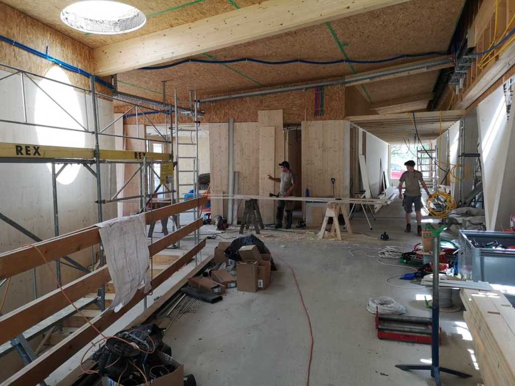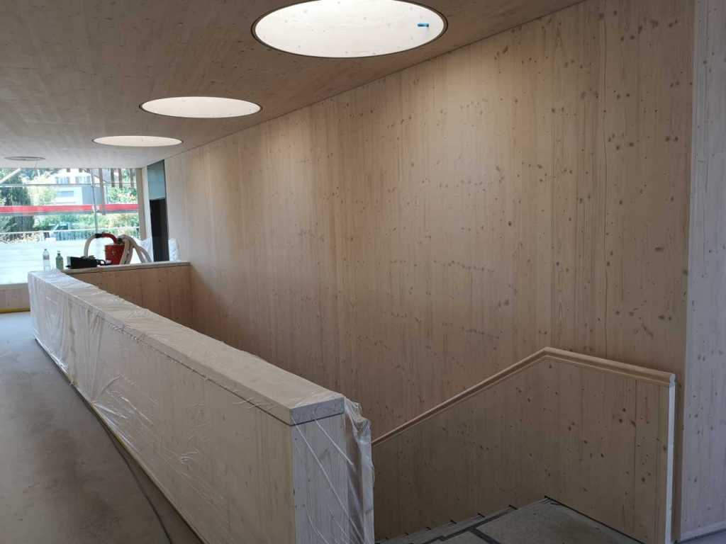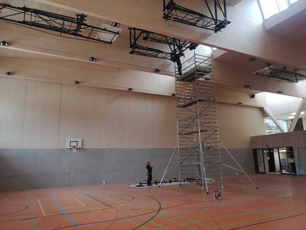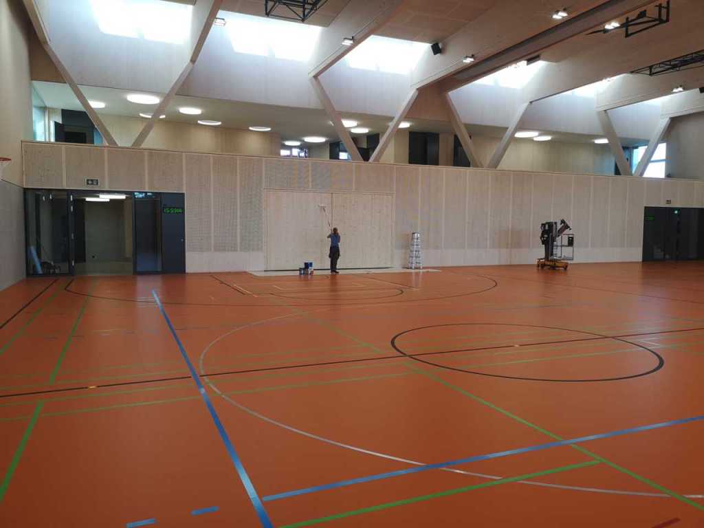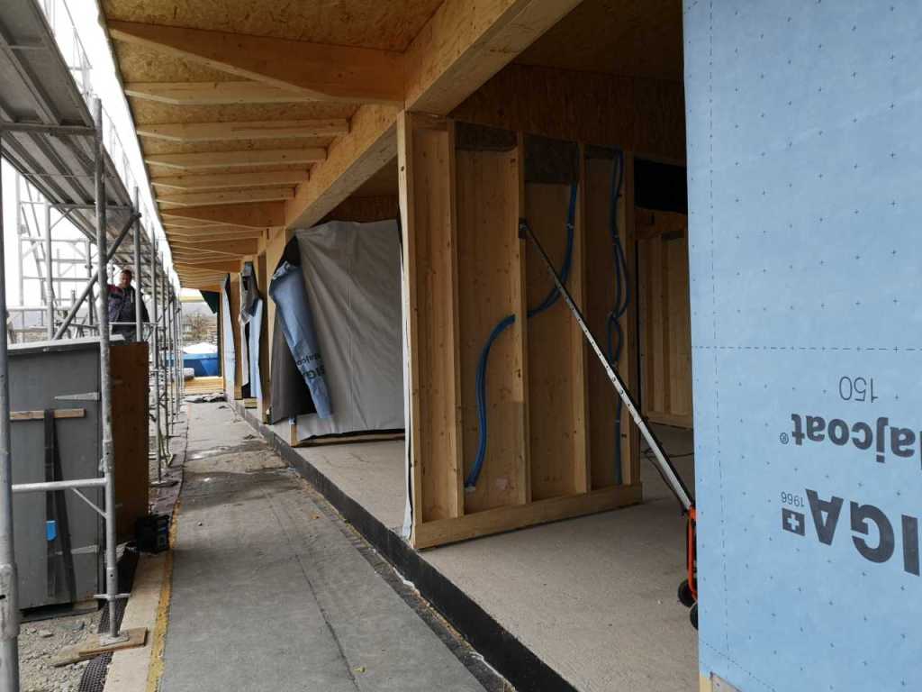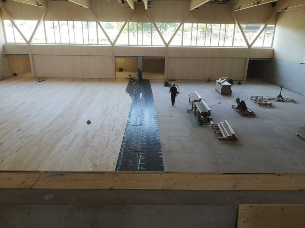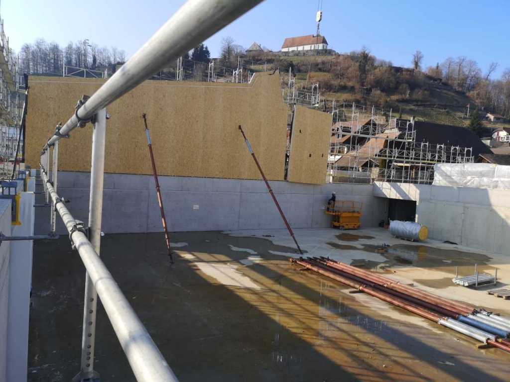 Flug durch die Sporthalle (14.10.22)Die Türe vor der Boulderwand ist montiert (07.10.22)Dachdeckerarbeiten am kleinen „Kamelbuckel“ (07.10.22)Ruhebänkli im Eingangsbereich (07.10.22)Erkennst du den Riss noch nach der Behandlung? (05.10.22)Die Bodenkosmetikerin an der Arbeit an Rissen (05.1022)Arbeiten an der Fassade der Eingangsfront (05.10.22)Durchreiche in die Teeküche (05.10.22)Das Material für den Geräteraum wurde angeliefert (03.10.22)Fuss- und Veloweg (03.10.22)Hallen aus Sicht der Geräteräume (30.09.22)Halle mit Blick auf die Tribüne und Dachkonstruktion (30.09.22)Technikraum (30.09.22)Garderobe (30.09.22)Gang zu den Garderoben mit runden Wandleuchten (30.09.22)Die Treppe von unten gesehen (30.09.22)Treppe zu den Garderoben (30.09.22)Stehtribüne (30.09.22)Foyer (30.09.22)In den letzten Tag fanden erste Vorabnahmen statt (30.09.22)Das Regenwetter der letzten Tag ist auch ein Test für die Regenwasserversickerungsanlage (29.09.22)Digitale Uhranlage, die gleichzeitig auch eine Stoppuhr ist in der Sporthalle (29.09.22)Bauleiterin Farida Krähenbühl mit einem deutschen Dachdeckergesellen in der Kluft (27.09.22)Die Hallen-Trennwand ist eingezogen (26.09.22)„Nest“ nennt sich dieser Typ Wasserabdeckung im Eingangsbereich (in Anlehnung an Herzog&De Meurons Nest-Stadion in Peking) 26.09.22Ring- und Taugeräte werden montiert (26.09.22)Dusche (26.09.22)Stand der Arbeiten beim zweiten Kamelbuckel (24.09.22)Dachfläche auf der Nordseite mit dem ersten Kamelbuckel (24.09.22)Der Bauspengler an der Arbeit bei der Fenstereinfassung (24.09.22)Blick in die Teeküche mit Durchreiche zum Foyer (24.09.22)Die Arbeiter und Maschinen der Moor AG im Einsatz auf dem Vorplatz (2309.22)Der Vorplatz wird goudroniert (23.09.22)Buebe-Toilette (2309.22)Auf der Vorderseite des Sichtschutzes in den Garderoben gibt es kleine Schränkli (23.09.22)Geräteraumeinrichtungen werden montiert (23.09.22)In den Garderoben wird der Sichtschutz montiert (22.09.22)Die Trennwand zwischen den beiden Hallen wird vor Ort genäht und montiert (22.09.22)Die Beleuchtung im Foyer mit den LED-Lichtbändern an den drei Oblichtern (22.09.22)Blick vom Duschraum zur Garderobe (20.09.22)Die Griffe der Boulderwand werden montiert (19.09.22)Im Vorfeld der Halle wird der Platz planiert (19.09.22)Die Tore zu den Geräteräumen werden montiert (19.09.22)Die WC haben nun auch Tür und Trennwände erhalten (19.09.22)WC sind montiert, wenn der Kredit reicht, gibt es noch Trennwände;-) (13.09.22)Die Bodenmarkierungen sind angebracht (12.09.22)Der PU-Boden in den Garderoben wird eingebracht (09.09.22) Foto Farida KrähenbühlDer Aussenbereich mit dem Veloweg nimmt Formen an (09.09.22)Die Teeküche im Foyer wird montiert (09.09.22)Auf dem Hallenboden werden die Markierungen vorbereitet (09.09.22)die Beleuchtung im Foyer ist montiert (07.09.22)eine weitere Schicht des Hallenbodens ist aufgetragen (07.09.22)Aussenansicht Stand 02.09.22eine weitere Schicht wird auf dem Hallenboden aufgetragen (02.09.22)Drei Oblichter beleuchten den Treppenabgang (02.09.22)Die Firma Moor ist am Vorbereiten des Zufahrtsweges für Velos und Fussgänger (01.09.22)Arbeiten an der Fassade (30.08.22)Die Brüstung der Stehtribüne ist mit einem dicken Brett abgedeckt (26.08.22)Die Sprossenwände werden montiert (26.08.22)Der Hallenboden wird gelegt (24.08.22)Die Eingangsfront wird sichtbar (23.08.22)Sicht von der Tribüne in die Halle. Stand 19.8.22Sicht von der Halle Richtung Tribüne. Stand 19.8.22Die Hebebühnen wurden aus dieser Öffnung im Geräteraum gehoben, dafür wurden bereits vier Barren hineingehievt. Die Öffnung wird wieder verschlossen. (19.08.22)Die Decke im Foyer wird durch die Zimmerleute montiert (15.08.22)Arbeiten an der Decke im Tribünenbereich (15.8.22)Auf dem Dach sind die ersten Eternitschindeln montiert (10.08.22)Die Eingangsfront und die Dachuntersicht ist bald fertig (10.08.22)Die Holzabdeckungen werden zum zweiten Mal lasiert (08.08.22)Hier werden die Griffe der Boulderwand montiert (08.08.22)Basketballanlage ist montiert (25.07.22)Die Ringanlage an der Hallendecke wird montiert (18.07.22)Blick von der Tribüne in die Halle – Fenster und Licht sind montiert (30.06.22)Dach und Fassade wären bereit für die Eternitschindeln (29.06.22)Im Foyer wird die Untersicht eingebaut (24.06.22)Im Eingangsbereich der Sporthalle (21.06.22)Wie ein Bilderrahmen wirkt das neue Fenstere gegen den Staufberg (15.06.22)Ein Türflügel wird montiert (15.06.22)Die ersten Fenster auf der Südseite sind montiert (14.06.22)Heizschlangen auf dem Hallenboden (08.06.22)Lukas Ziltener und sein Team montieren die PV-Anlage (03.06.22)Die Innenverkleidungen in der Halle sind fast fertig (30.05.22)Vorbereitungsarbeiten für die Montage der PV-Anlage (17.05.22)Die Hallendecke wird montiert (17.05.22)Dachlattung (17.05.22)Blick in die Halle Stand 12.05.22Blick von der Südseite durch die Halle auf die Tribüne (02.05.22)Aussensicht Stand 21.04.2022Die erste Dreischicht-Holzplatte der Innenwand ist montiert (21.04.22)Haustechnik: Montage Lüftung (21.04.22)Haustechnik: Wärmeverteilung (19.04.22)Haustechnik: Duschanlage (19.04.22)Arbeiten auf dem Dach (06.04.22)Der Blick von der Tribüne lässt die künftige Atmosphäre der Halle erahnen (30.03.22)Die Eingangspartie mit Vordach ist erkennbar (30.03.22)Das Dach ist eingedeckt und das Aufrichtebäumli steht (24.03.22)Das Dach wird eingedeckt (22.03.22)Alle acht Binder sind montiert (16.03.22)Die ersten fünf Binder überbrücken die Halle (15.03.22)Der erste Binder kommt geflogen… (14.03.22)Der Moment, wo der Frutiger-Kran die Kirche auf den Staufberg absetzt (13.03.22) Foto Thomas VollenweiderAm Montag, 14. März werden die Binder mit dem Pneukran auf die Y-Stützen montiert (11.03.22)Der Hilfskran steht bereit für die Montage der 30m langen Binder (11.03.22)Die Seitenwände sind aufgerichtet (11.03.22)Blick durch ein Fenster der Ostwand auf die Hostet (09.03.22)Die Y-Stützen für die grossen Binder werden montiert