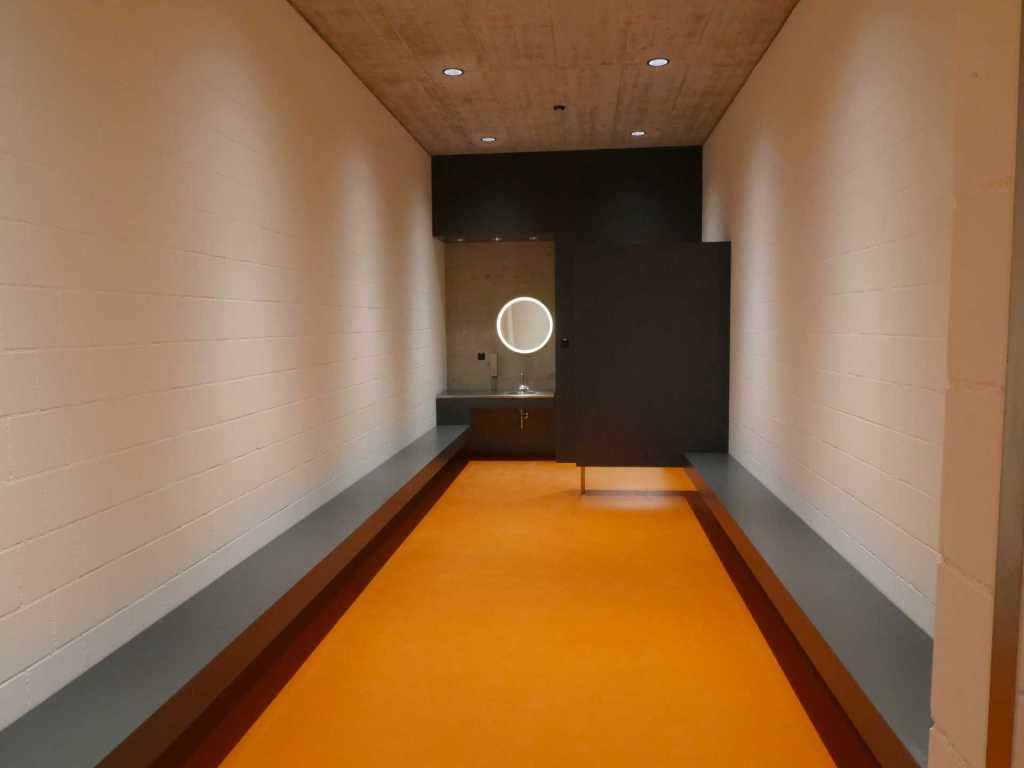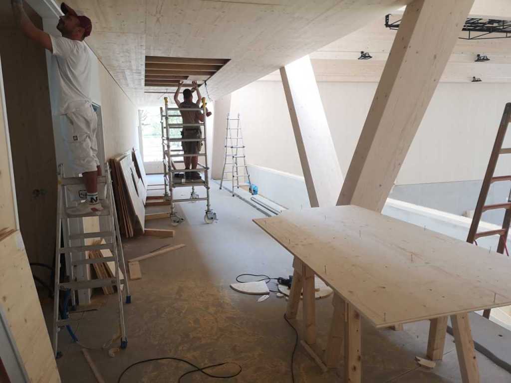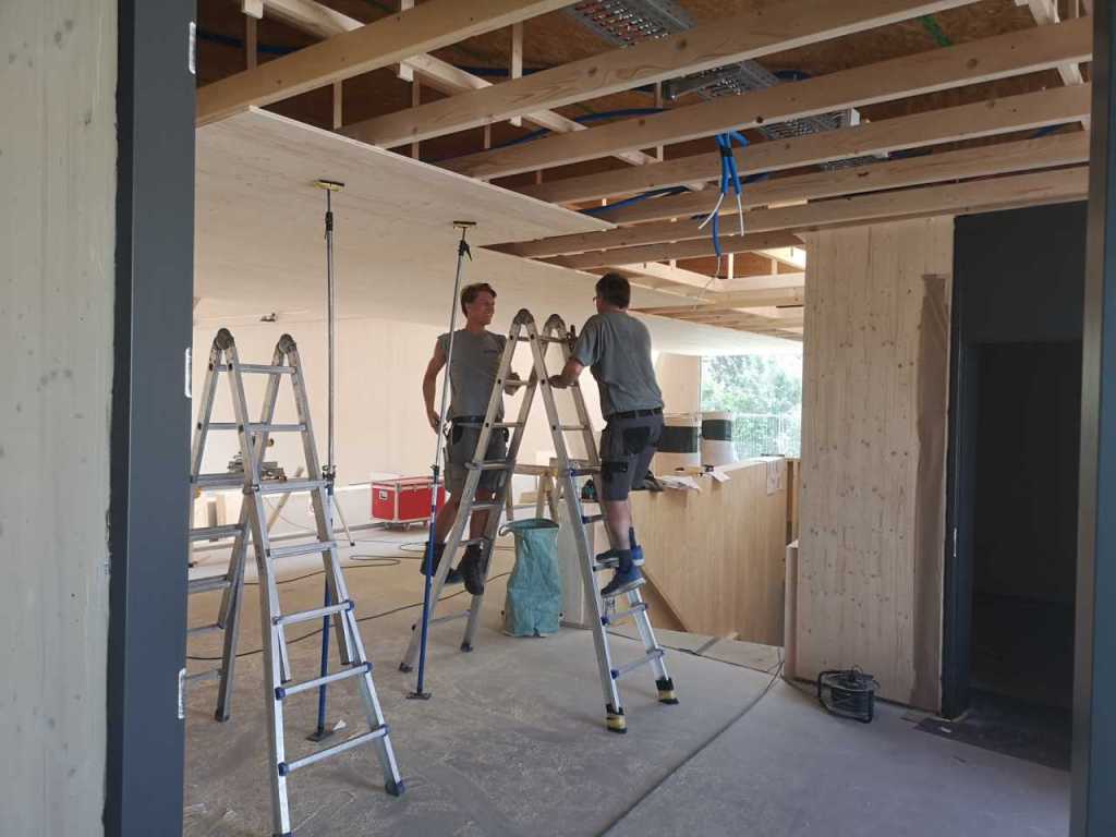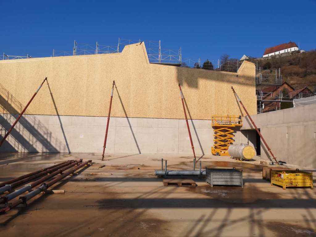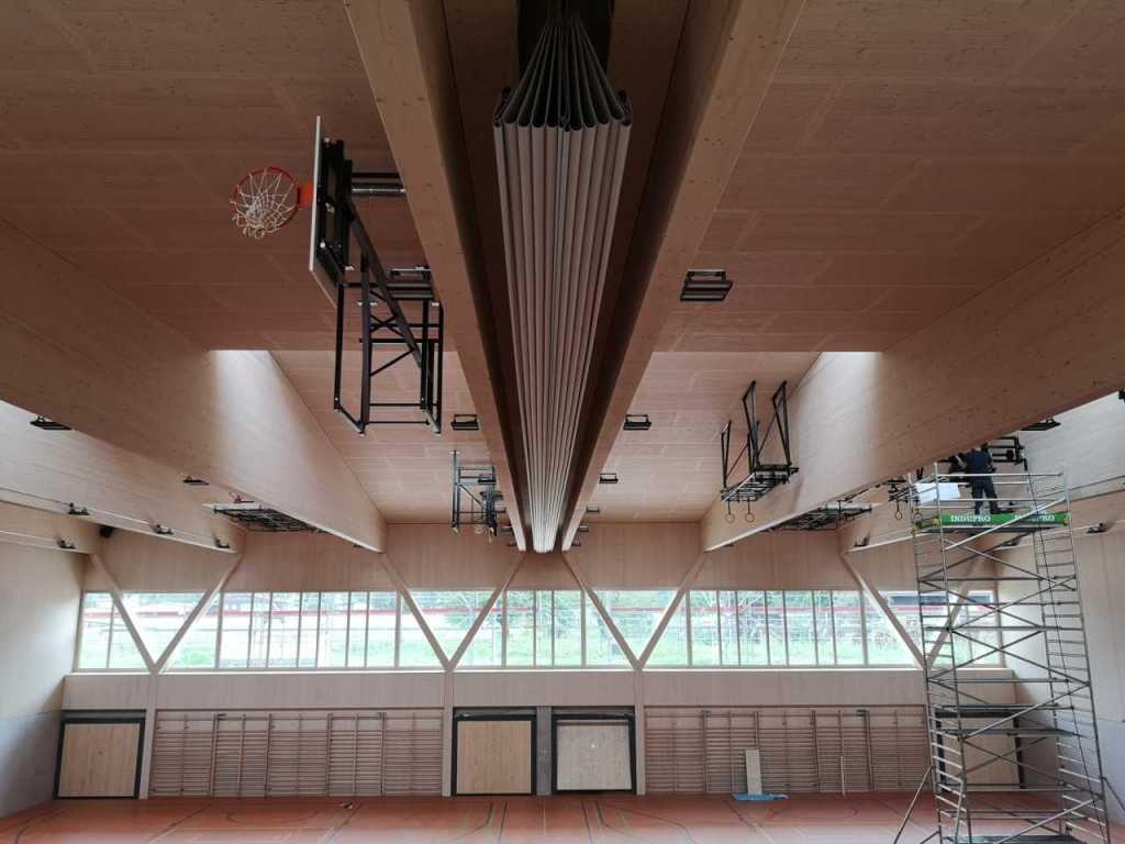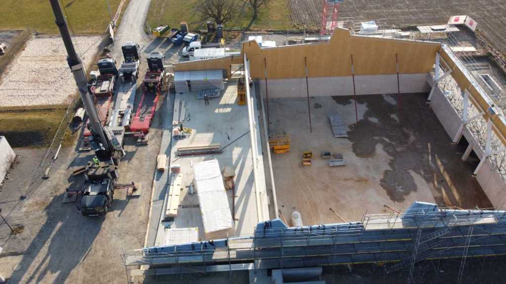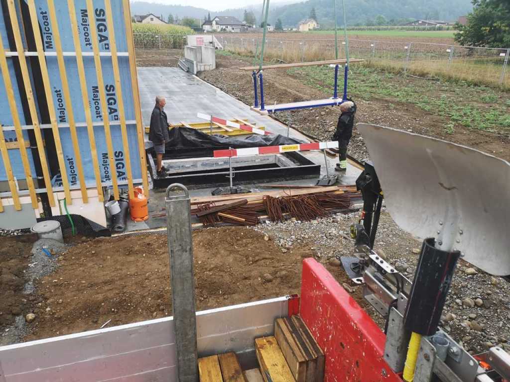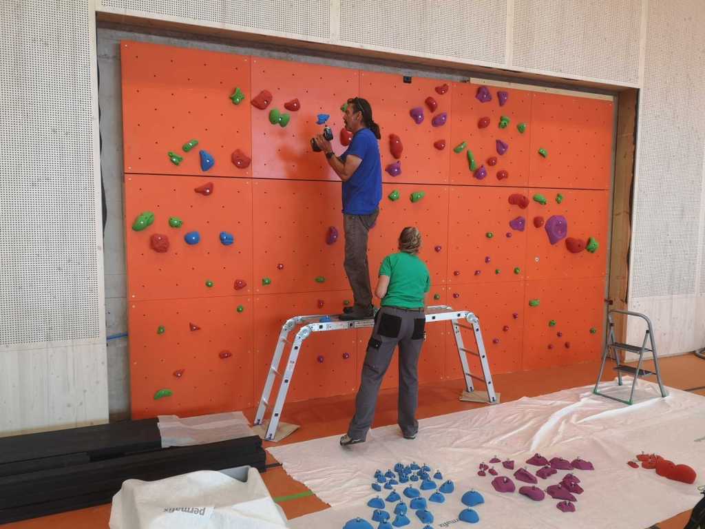 Flug durch die Sporthalle (14.10.22)Die Türe vor der Boulderwand ist montiert (07.10.22)Dachdeckerarbeiten am kleinen „Kamelbuckel“ (07.10.22)Ruhebänkli im Eingangsbereich (07.10.22)Erkennst du den Riss noch nach der Behandlung? (05.10.22)Die Bodenkosmetikerin an der Arbeit an Rissen (05.1022)Arbeiten an der Fassade der Eingangsfront (05.10.22)Durchreiche in die Teeküche (05.10.22)Das Material für den Geräteraum wurde angeliefert (03.10.22)Fuss- und Veloweg (03.10.22)Hallen aus Sicht der Geräteräume (30.09.22)Halle mit Blick auf die Tribüne und Dachkonstruktion (30.09.22)Technikraum (30.09.22)Garderobe (30.09.22)Gang zu den Garderoben mit runden Wandleuchten (30.09.22)Die Treppe von unten gesehen (30.09.22)Treppe zu den Garderoben (30.09.22)Stehtribüne (30.09.22)Foyer (30.09.22)In den letzten Tag fanden erste Vorabnahmen statt (30.09.22)Das Regenwetter der letzten Tag ist auch ein Test für die Regenwasserversickerungsanlage (29.09.22)Digitale Uhranlage, die gleichzeitig auch eine Stoppuhr ist in der Sporthalle (29.09.22)Bauleiterin Farida Krähenbühl mit einem deutschen Dachdeckergesellen in der Kluft (27.09.22)Die Hallen-Trennwand ist eingezogen (26.09.22)„Nest“ nennt sich dieser Typ Wasserabdeckung im Eingangsbereich (in Anlehnung an Herzog&De Meurons Nest-Stadion in Peking) 26.09.22Ring- und Taugeräte werden montiert (26.09.22)Dusche (26.09.22)Stand der Arbeiten beim zweiten Kamelbuckel (24.09.22)Dachfläche auf der Nordseite mit dem ersten Kamelbuckel (24.09.22)Der Bauspengler an der Arbeit bei der Fenstereinfassung (24.09.22)Blick in die Teeküche mit Durchreiche zum Foyer (24.09.22)Die Arbeiter und Maschinen der Moor AG im Einsatz auf dem Vorplatz (2309.22)Der Vorplatz wird goudroniert (23.09.22)Buebe-Toilette (2309.22)Auf der Vorderseite des Sichtschutzes in den Garderoben gibt es kleine Schränkli (23.09.22)Geräteraumeinrichtungen werden montiert (23.09.22)In den Garderoben wird der Sichtschutz montiert (22.09.22)Die Trennwand zwischen den beiden Hallen wird vor Ort genäht und montiert (22.09.22)Die Beleuchtung im Foyer mit den LED-Lichtbändern an den drei Oblichtern (22.09.22)Blick vom Duschraum zur Garderobe (20.09.22)Die Griffe der Boulderwand werden montiert (19.09.22)Im Vorfeld der Halle wird der Platz planiert (19.09.22)Die Tore zu den Geräteräumen werden montiert (19.09.22)Die WC haben nun auch Tür und Trennwände erhalten (19.09.22)WC sind montiert, wenn der Kredit reicht, gibt es noch Trennwände;-) (13.09.22)Die Bodenmarkierungen sind angebracht (12.09.22)Der PU-Boden in den Garderoben wird eingebracht (09.09.22) Foto Farida KrähenbühlDer Aussenbereich mit dem Veloweg nimmt Formen an (09.09.22)Die Teeküche im Foyer wird montiert (09.09.22)Auf dem Hallenboden werden die Markierungen vorbereitet (09.09.22)die Beleuchtung im Foyer ist montiert (07.09.22)eine weitere Schicht des Hallenbodens ist aufgetragen (07.09.22)Aussenansicht Stand 02.09.22eine weitere Schicht wird auf dem Hallenboden aufgetragen (02.09.22)Drei Oblichter beleuchten den Treppenabgang (02.09.22)Die Firma Moor ist am Vorbereiten des Zufahrtsweges für Velos und Fussgänger (01.09.22)Arbeiten an der Fassade (30.08.22)Die Brüstung der Stehtribüne ist mit einem dicken Brett abgedeckt (26.08.22)Die Sprossenwände werden montiert (26.08.22)Der Hallenboden wird gelegt (24.08.22)Die Eingangsfront wird sichtbar (23.08.22)Sicht von der Tribüne in die Halle. Stand 19.8.22Sicht von der Halle Richtung Tribüne. Stand 19.8.22Die Hebebühnen wurden aus dieser Öffnung im Geräteraum gehoben, dafür wurden bereits vier Barren hineingehievt. Die Öffnung wird wieder verschlossen. (19.08.22)Die Decke im Foyer wird durch die Zimmerleute montiert (15.08.22)Arbeiten an der Decke im Tribünenbereich (15.8.22)Auf dem Dach sind die ersten Eternitschindeln montiert (10.08.22)Die Eingangsfront und die Dachuntersicht ist bald fertig (10.08.22)Die Holzabdeckungen werden zum zweiten Mal lasiert (08.08.22)Hier werden die Griffe der Boulderwand montiert (08.08.22)Basketballanlage ist montiert (25.07.22)Die Ringanlage an der Hallendecke wird montiert (18.07.22)Blick von der Tribüne in die Halle – Fenster und Licht sind montiert (30.06.22)Dach und Fassade wären bereit für die Eternitschindeln (29.06.22)Im Foyer wird die Untersicht eingebaut (24.06.22)Im Eingangsbereich der Sporthalle (21.06.22)Wie ein Bilderrahmen wirkt das neue Fenstere gegen den Staufberg (15.06.22)Ein Türflügel wird montiert (15.06.22)Die ersten Fenster auf der Südseite sind montiert (14.06.22)Heizschlangen auf dem Hallenboden (08.06.22)Lukas Ziltener und sein Team montieren die PV-Anlage (03.06.22)Die Innenverkleidungen in der Halle sind fast fertig (30.05.22)Vorbereitungsarbeiten für die Montage der PV-Anlage (17.05.22)Die Hallendecke wird montiert (17.05.22)Dachlattung (17.05.22)Blick in die Halle Stand 12.05.22Blick von der Südseite durch die Halle auf die Tribüne (02.05.22)Aussensicht Stand 21.04.2022Die erste Dreischicht-Holzplatte der Innenwand ist montiert (21.04.22)Haustechnik: Montage Lüftung (21.04.22)Haustechnik: Wärmeverteilung (19.04.22)Haustechnik: Duschanlage (19.04.22)Arbeiten auf dem Dach (06.04.22)Der Blick von der Tribüne lässt die künftige Atmosphäre der Halle erahnen (30.03.22)Die Eingangspartie mit Vordach ist erkennbar (30.03.22)Das Dach ist eingedeckt und das Aufrichtebäumli steht (24.03.22)Das Dach wird eingedeckt (22.03.22)Alle acht Binder sind montiert (16.03.22)Die ersten fünf Binder überbrücken die Halle (15.03.22)Der erste Binder kommt geflogen… (14.03.22)Der Moment, wo der Frutiger-Kran die Kirche auf den Staufberg absetzt (13.03.22) Foto Thomas VollenweiderAm Montag, 14. März werden die Binder mit dem Pneukran auf die Y-Stützen montiert (11.03.22)Der Hilfskran steht bereit für die Montage der 30m langen Binder (11.03.22)Die Seitenwände sind aufgerichtet (11.03.22)Blick durch ein Fenster der Ostwand auf die Hostet (09.03.22)Die Y-Stützen für die grossen Binder werden montiert