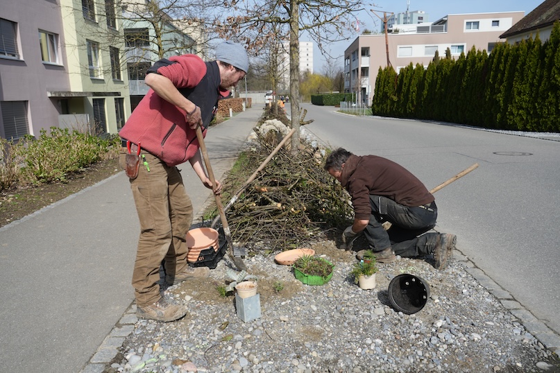 Am Chrüzweg bot sich die Gelegenheit, gleich mehrere wertvolle Strukturen zu erstellen: Ein Teil der Fläche wurde mit Wandkies und Wildbienensand ersetzt. Einheimische Pflanzen wurden gesetzt und gesät, auf dass ein reichhaltiges Nahrungsangebot für Insekten entsteht. Asthaufen, Wurzelstöcke und Steinhaufen bieten Unterschlupf und Nistmöglichkeiten. Auf kleinstem Raum wurde ein Paradies für Wildbienen, Insekten und viele andere Kleintiere erschaffen.