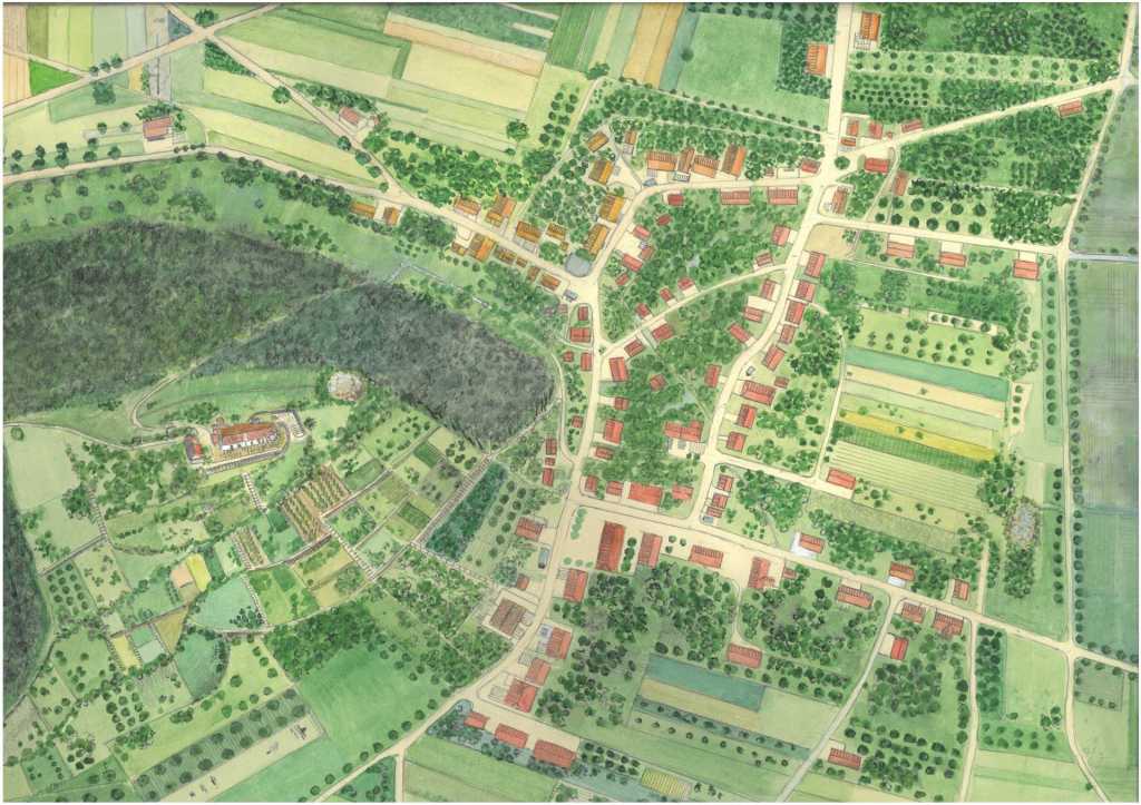 Der Zeichner Max Furter hat im April 2024 von der Fotovorlage Mittelholzers ein wunderbares und aufwändiges Aquarell gemalt. Es zeigt unser Dorf, wie es vor gut 100 Jahren aussah.