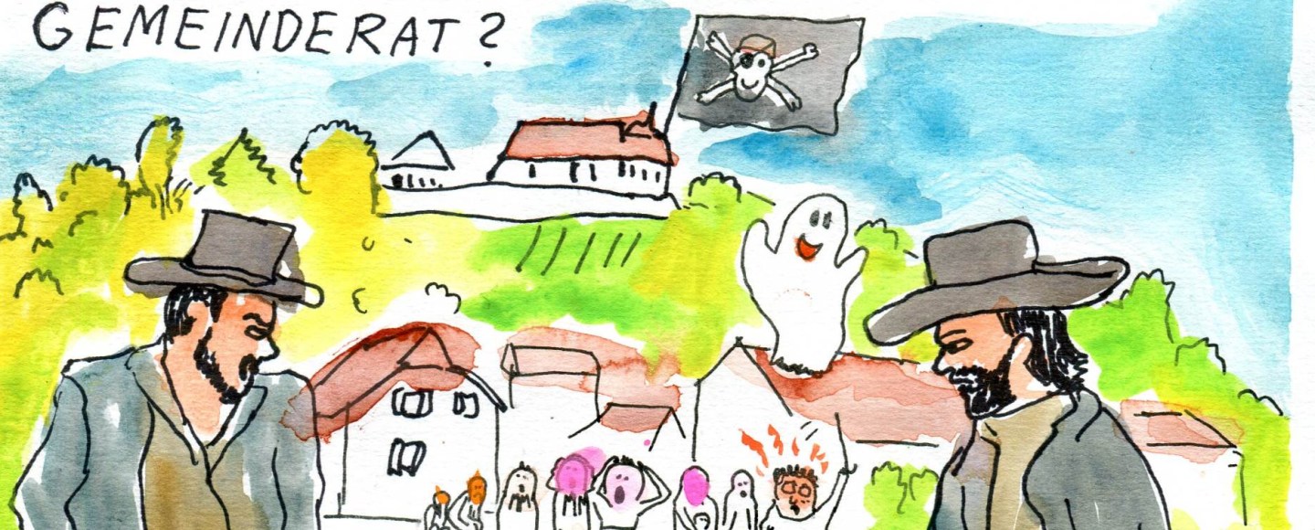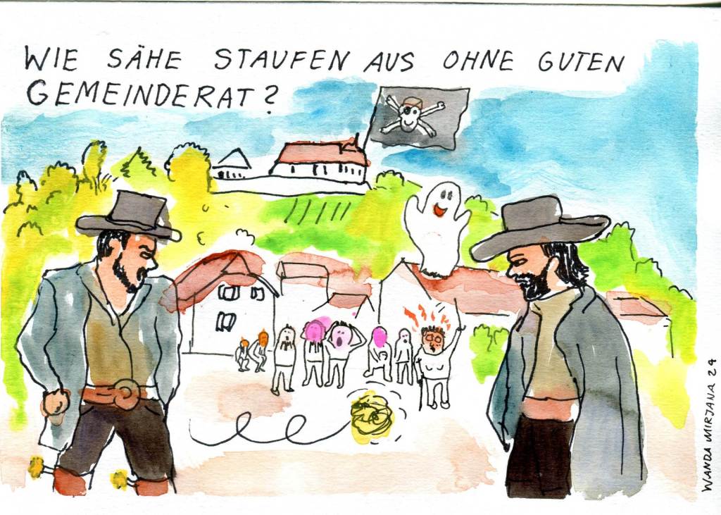 Wildwest-Szenen in Staufen? Piraten auf dem Staufberg? Faustrecht im Dorf? Die KI hat der Illustratorin Wanda Mirjana ein unschönes Bild unseres Dorfes beschrieben. Soweit will es niemand kommen lassen – deshalb komm an die Austauschveranstaltung mit dem Gemeinderat am Montag, 10. Februar 2025 um 19.30 Uhr im Zopfhuus. (grad nach den Sporferien)