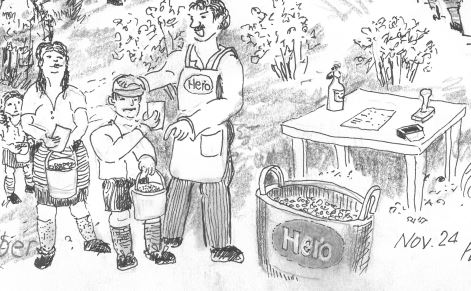 Im Hintergrund fein angedeutet Schloss- und Goffersberg. Rechts die Pflückete am steilen Osthang, die Mistträger und das praktische Trübelibänkli. Unten die Heerscharen Pflücker, die Hero-Leute und ganz rechts unten die Qualitätskontrolle durch den Trübeli-Vogt. Das Zeichnen hat mir viel Freude bereitet und Spass gemacht.“