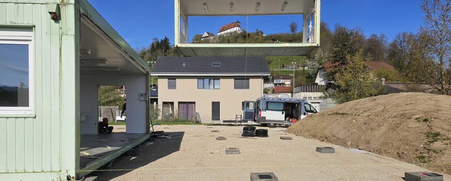 Am Mittwoch 9. April wurden die Schulcontainer von Niederlenz nach Staufen gezügelt. Während den Frühlingsferien werden hier drei Klassenzimmer sowie ein Gruppenraum und WC-Anlagen wieder installiert. Die Erschliessungsarbeiten für Wasser, Abwasser und Strom/Internet werden ebenfalls erledigt, so dass schon bald Klassen ins neue Provisorium zügeln können.