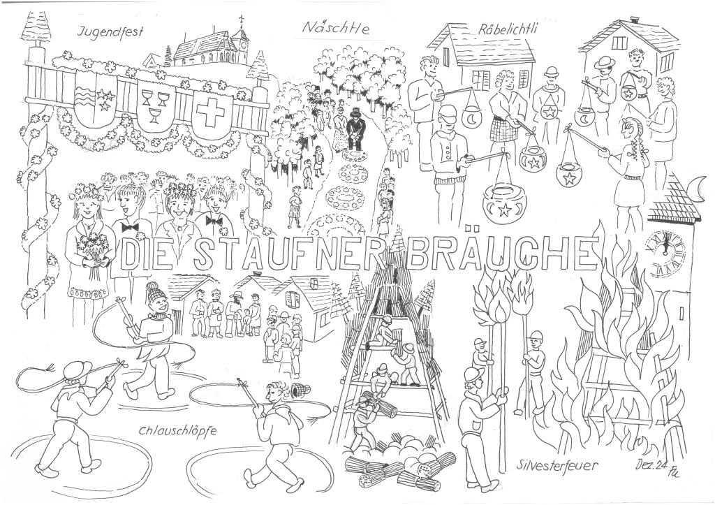 Die lange ersehnte Malvorlage zu den Staufner Bräuchen ist da! Max Furter hat eine Vorlage gezeichnet und stellt diese den Kindern aus Staufen gern zur Verfügung. Die Kinder können dabei während des Ausmalens über ihre Erlebnisse mit den Bräuchen in Staufen nachdenken und darüber erzählen.