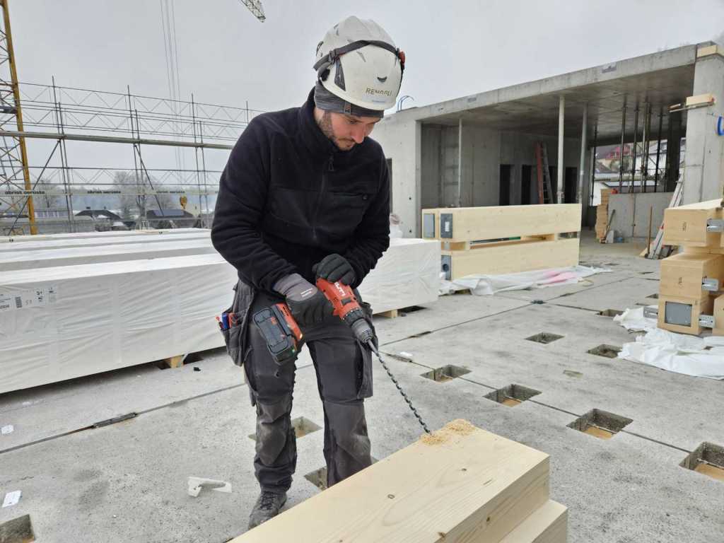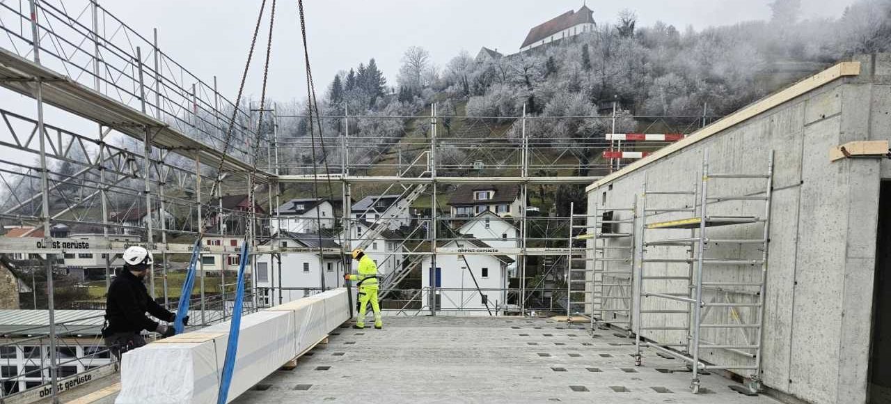 Das Aufrichten des „Neuen Schulhaus“ verläuft in raschen Schritten. Bereits sind bei zwei Etagen die Betonverbund-Holzdecken montiert und das dritte und letzte Stockwerk wird in den kommenden Tagen aufgerichtet. Jeden Tag erreichen mehrere Lastwagenzüge die Baustelle, die mit Holzelementen, dicken Balken für die Tragkonstruktion und schweren Betonverbundplatten beladen sind.