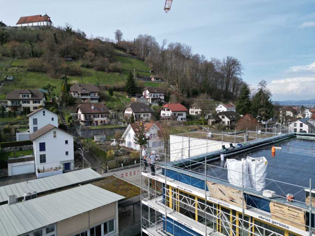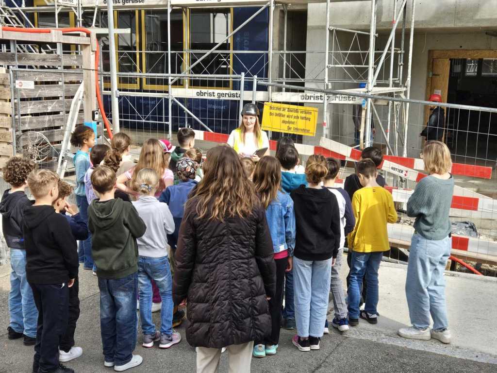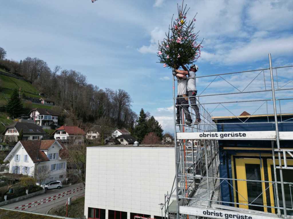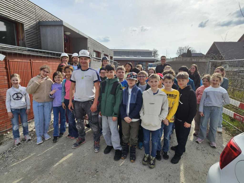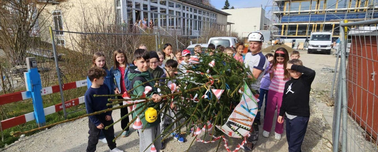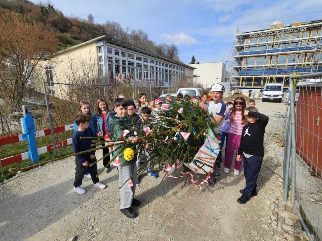 Am 10. März 2026 hat die Klasse 4b von Martina Staubli das von den Kindern geschmückte Aufrichtebäumchen den Zimmerleuten überbracht. Diese Geste des Dankes soll an das erfolgreiche Aufrichten den neuen Schulhauses erinnern. Innerhalb von ein paar wenigen Wochen im Januar/ Februar haben die Zimmerleute von Renggli die drei Stockwerke in Elementbauweise montiert und aufgerichtet.