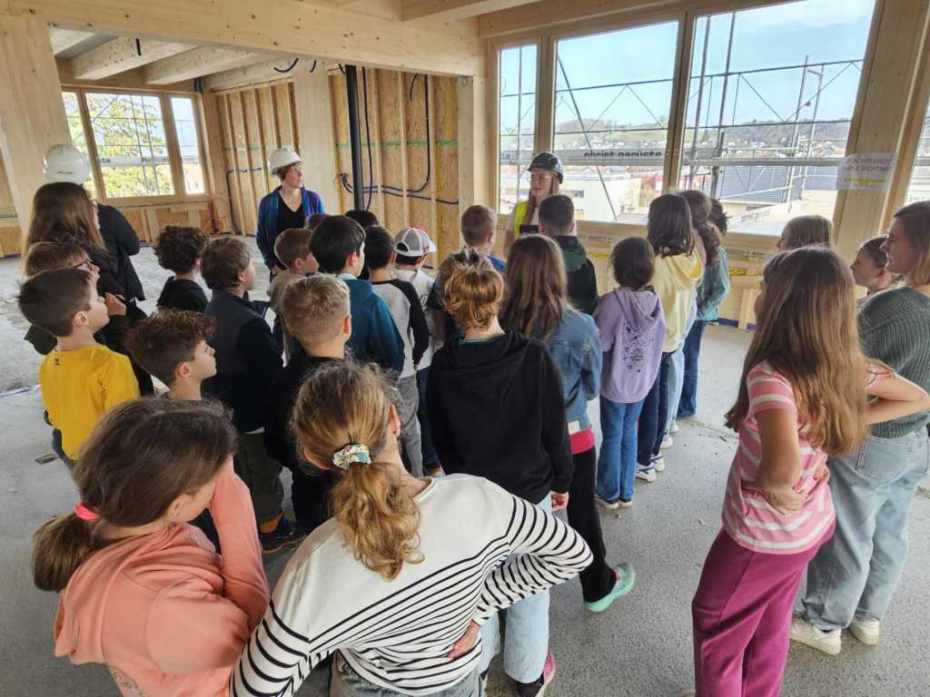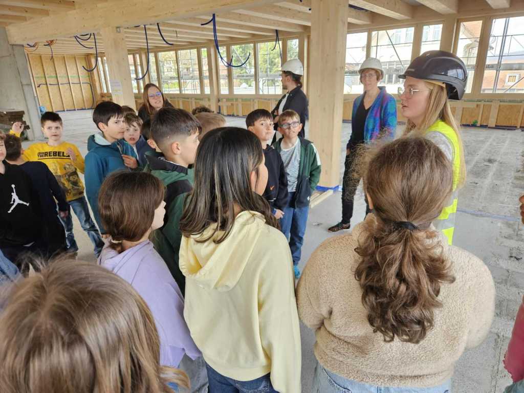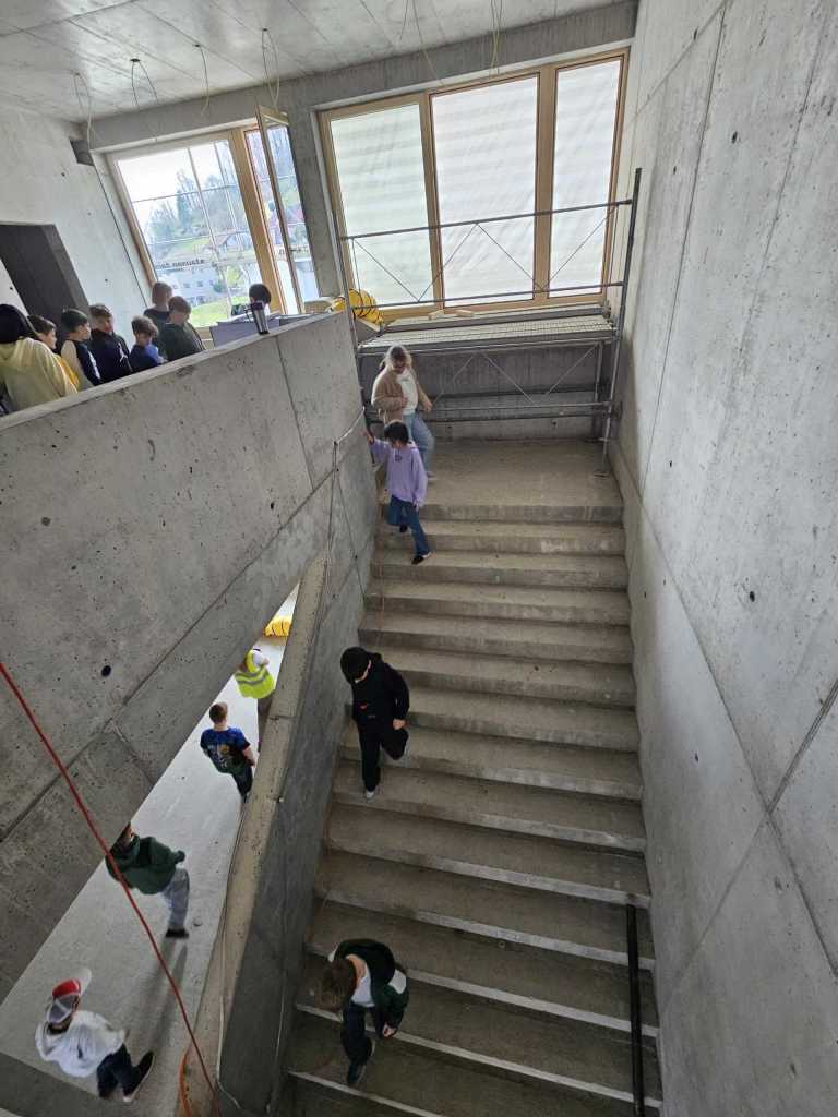 Nach der Übergabe des Tannli konnten die Schülerinnen und Schüler ihr künftiges Lernhaus besichtigen. Unter der Leitung und Aufsicht der Bauleiterin Talisa Blülle stellten sie ganz viel Fragen an die Bauleiterin und an die Architekten (die Mädchen redeten über die Grösse der WC’s, während die Buben mehr an Zahlen zum Neubau interessiert waren). Darüber hinaus konnten sie die grosszügige Atmosphäre im Neubau ein erstes Mal erkunden.