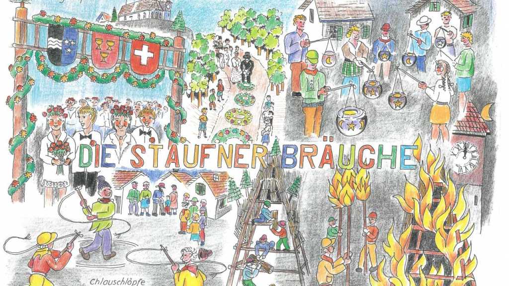 Max Furters Zeichnung zu den Bräuchen in Staufen im Jahresverlauf