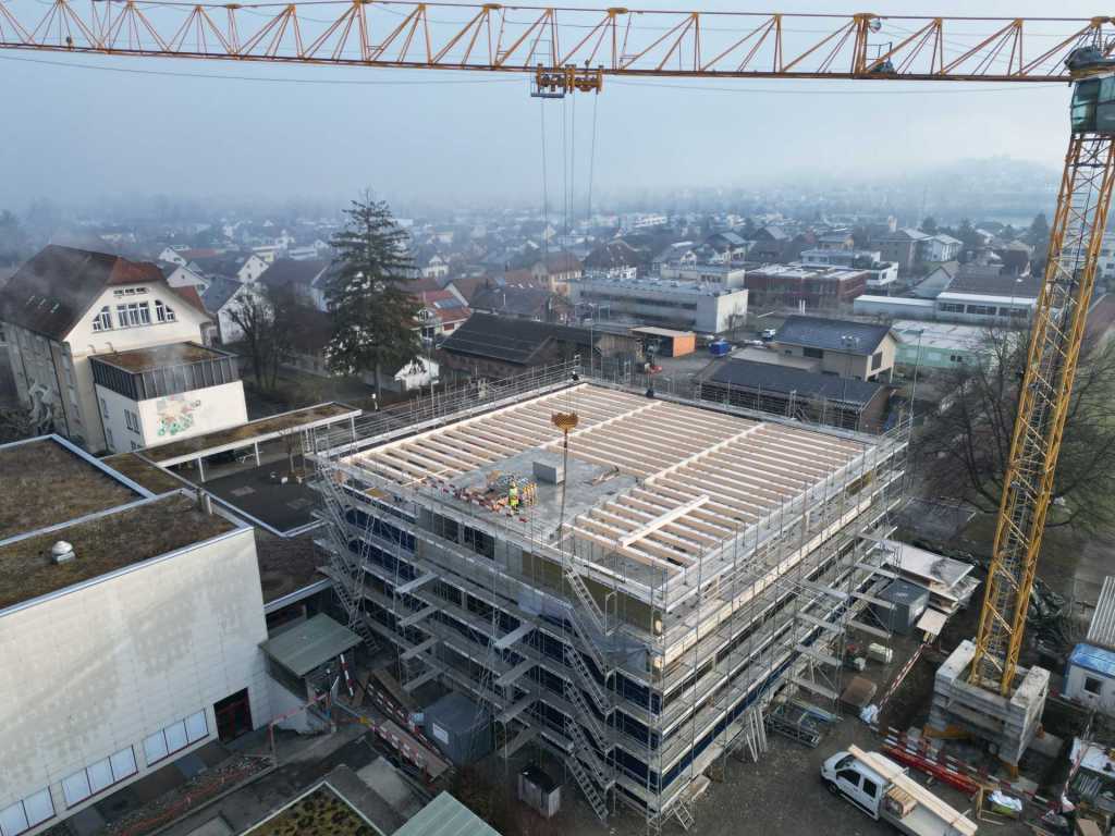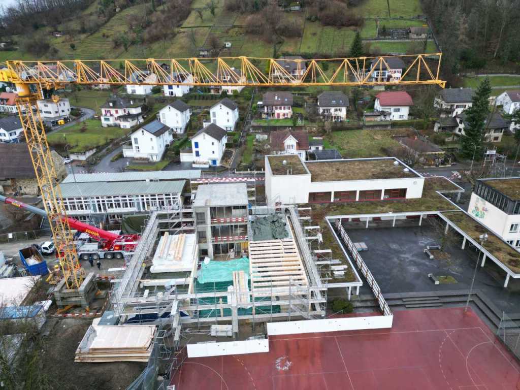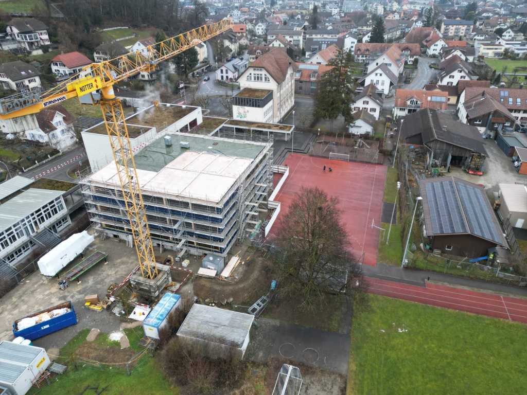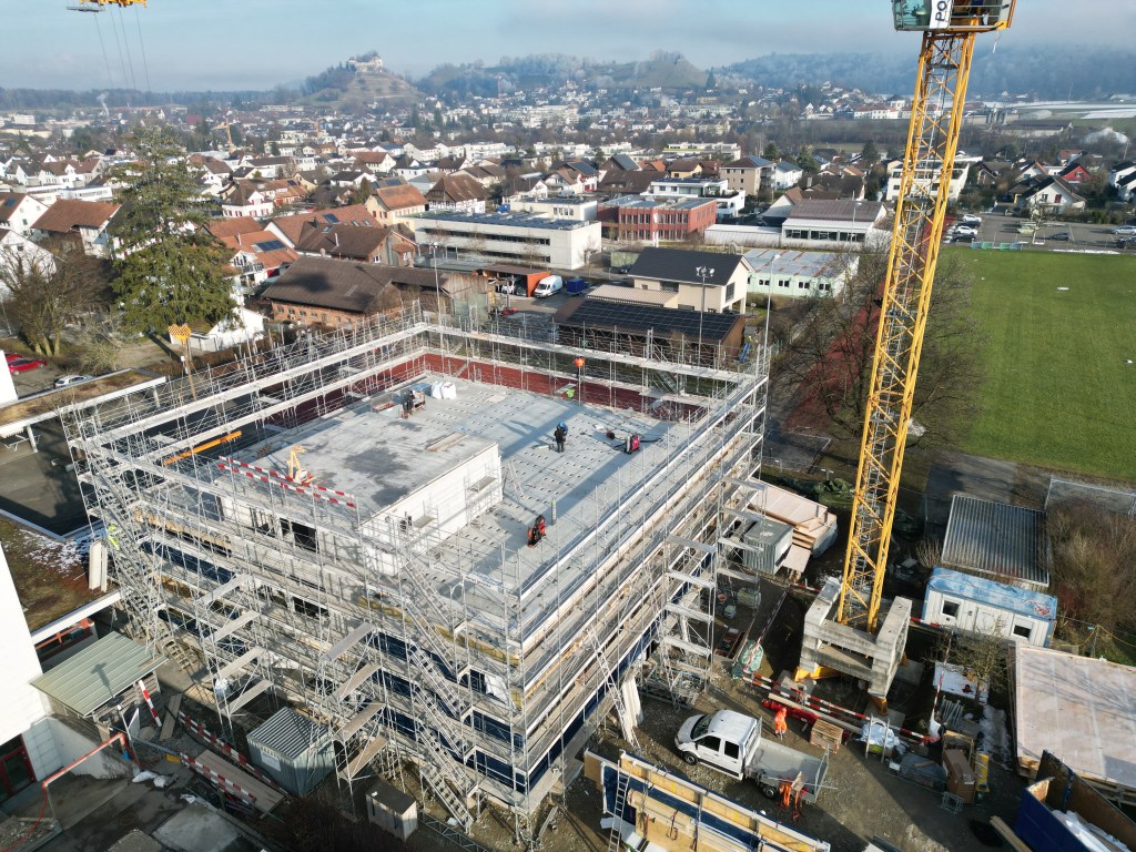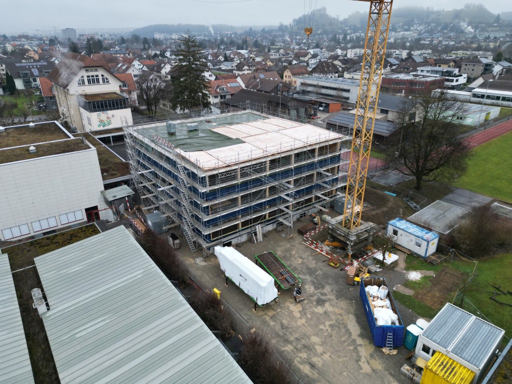 Stand der Arbeiten am 30.1.26: Höher und grösser wird das neue Schulhaus nicht mehr! Nur noch schöner. (klicken zum Vergrössern)