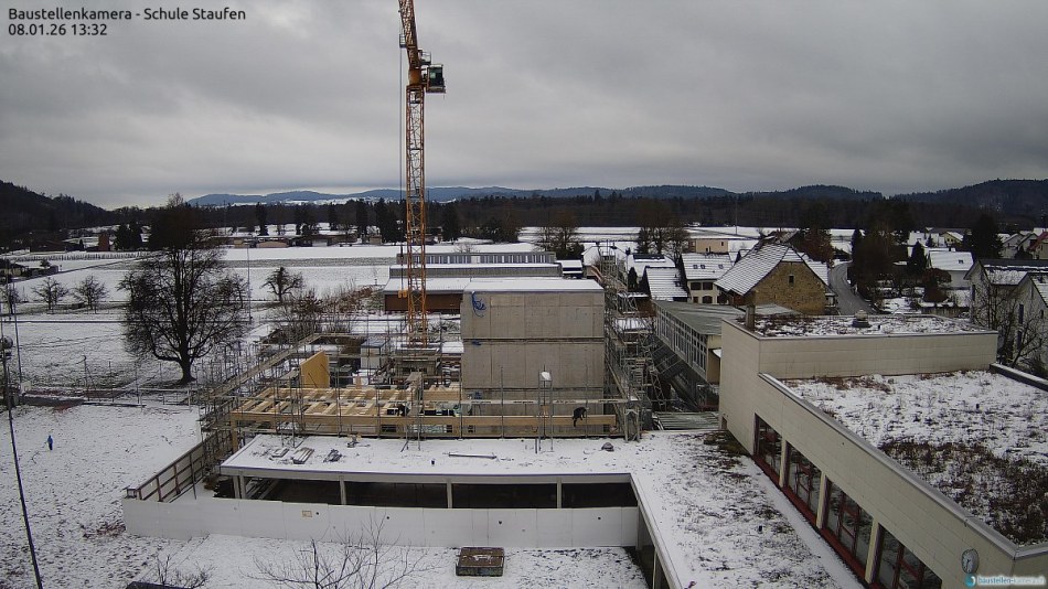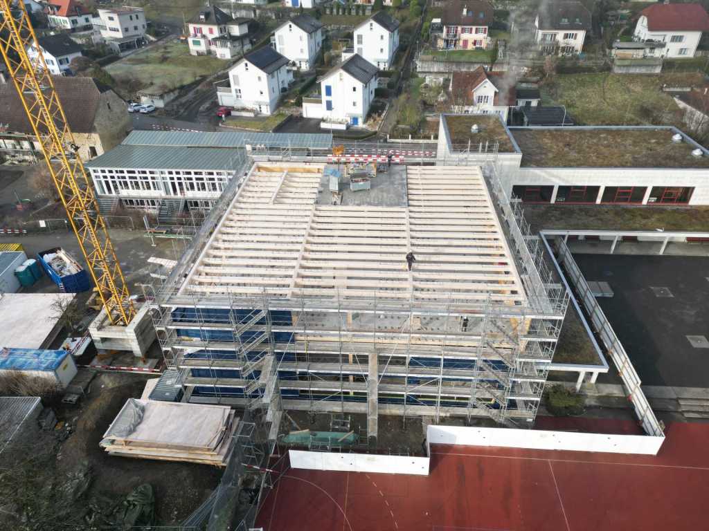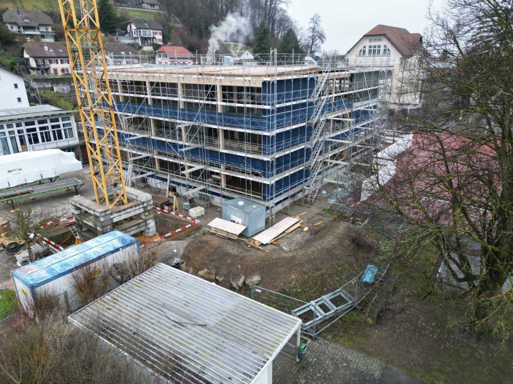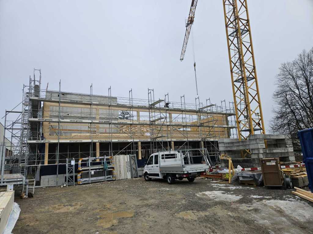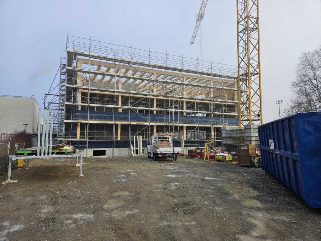 Stand der Arbeiten am 30.1.26: Höher und grösser wird das neue Schulhaus nicht mehr! Nur noch schöner. (klicken zum Vergrössern)